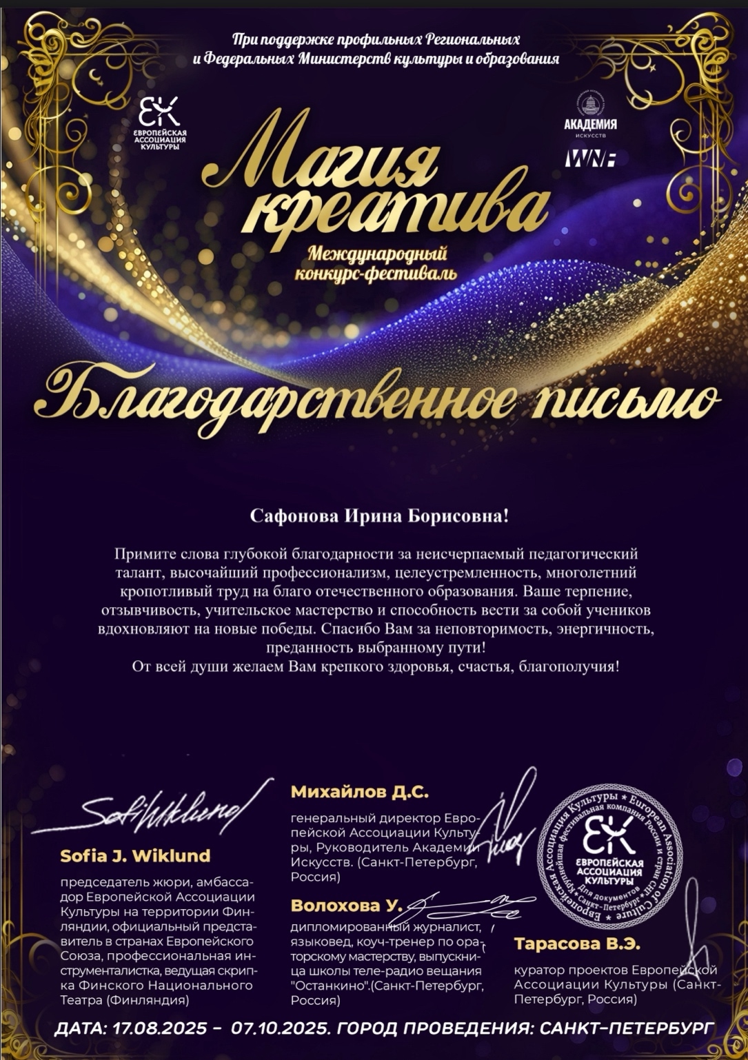 Фестиваль «Магия креатива» ставит своей целью не только выявление и всестороннюю поддержку талантливых и перспективных исполнителей, но и активный обмен профессиональным творческим опытом, а также укрепление дружественных отношений между участниками. Европейская Ассоциация Культуры, являющаяся организатором конкурса, регулярно проводит региональные, всероссийские, международные и европейские фестивали, а также премии в области исполнительского искусства как на территории России, так и в странах Европы, таких как Эстония, Швеция, Латвия, Нидерланды, Греция, Дания, Австрия.