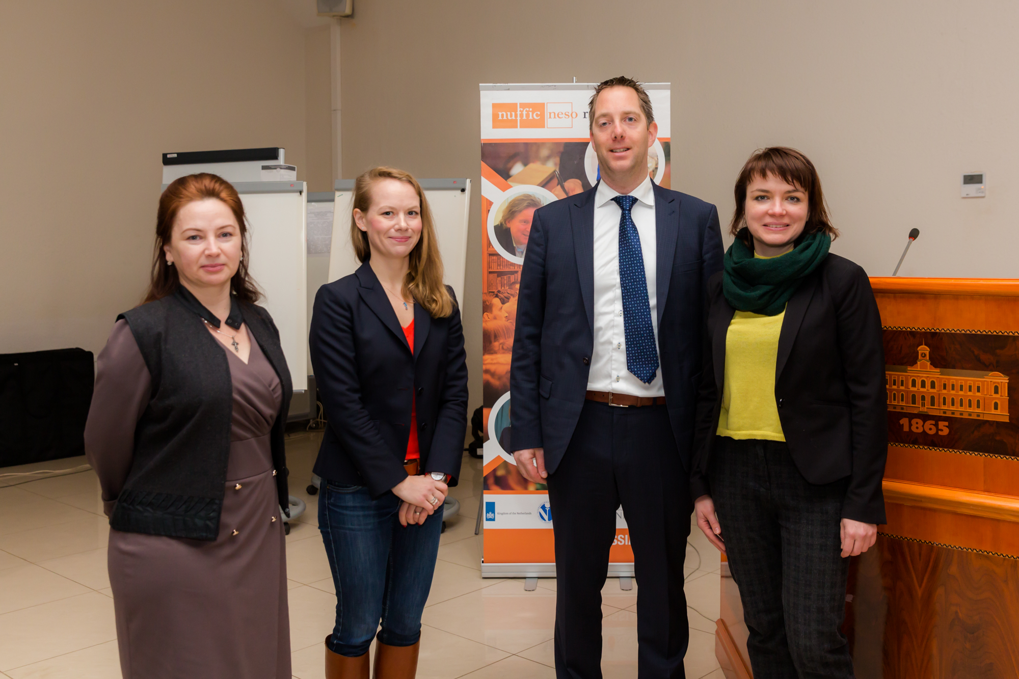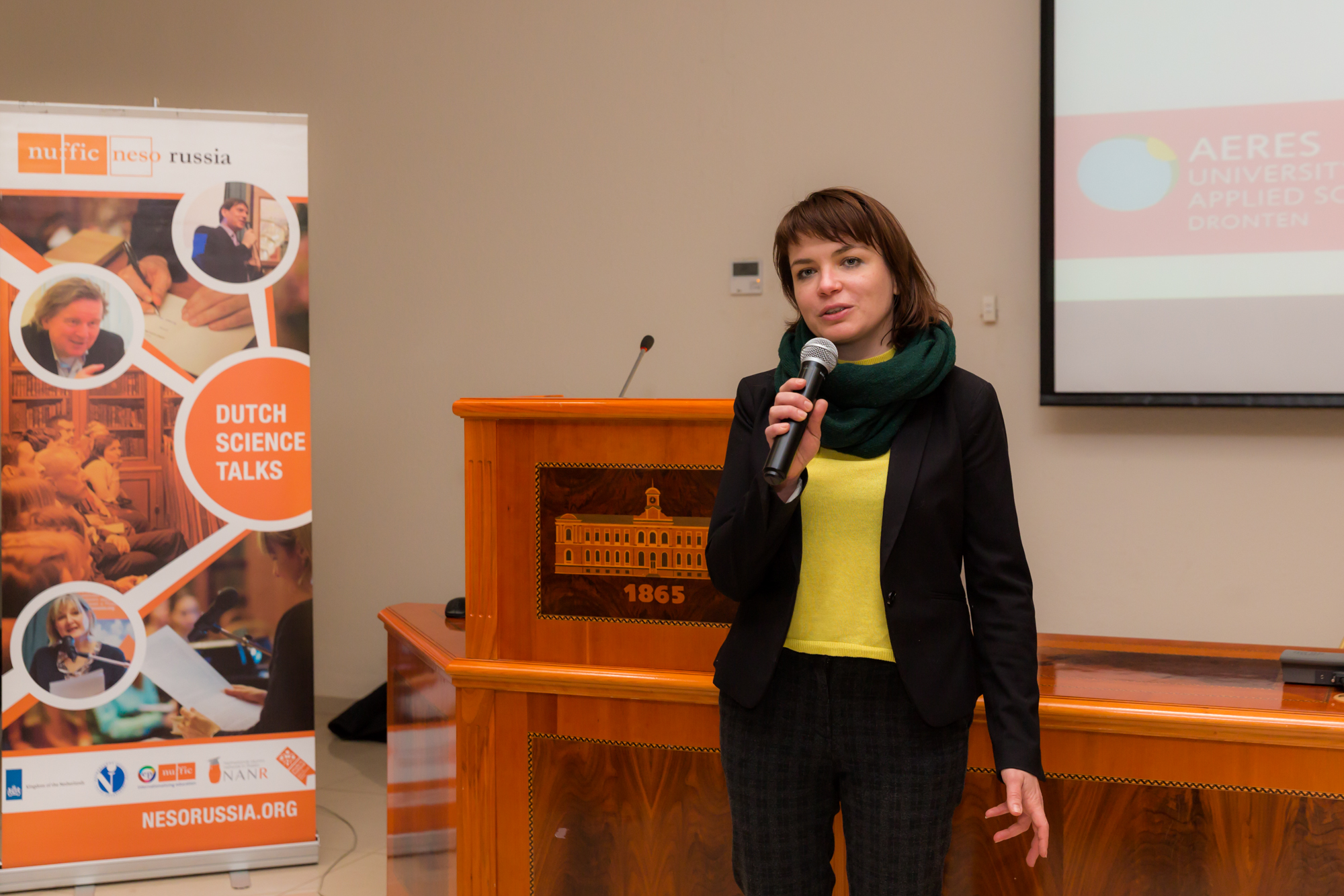 Заседание открыла Елена Агафонова, сотрудник Nuffic Neso Russia, представив собравшимся голландских исследователей. За ярким выступлением основного докладчика Алфреда Пота последовало не менее оживленное обсуждение на английском языке (несмотря на наличие переводчика-синхрониста), причем тон ее задала первая поднявшая руку студентка – девушка явно готовилась, но очень волновалась. И тогда на помощь пришла старшая коллега – Людмила Ивановна Хрусталева, много лет проработавшая в Нидерландах и отлично знакомая с их методами работы. Следующие ораторы последовали их примеру. Все студенты и преподаватели смогли получить исчерпывающие ответы на свои вопросы.