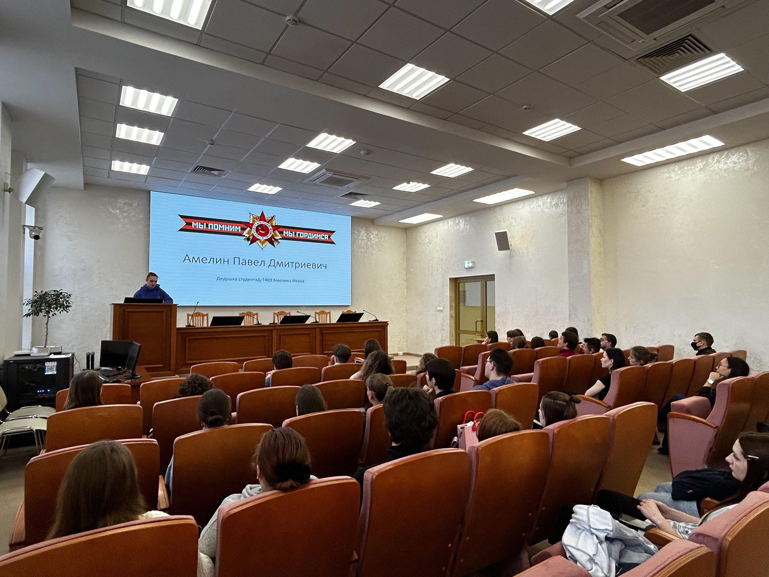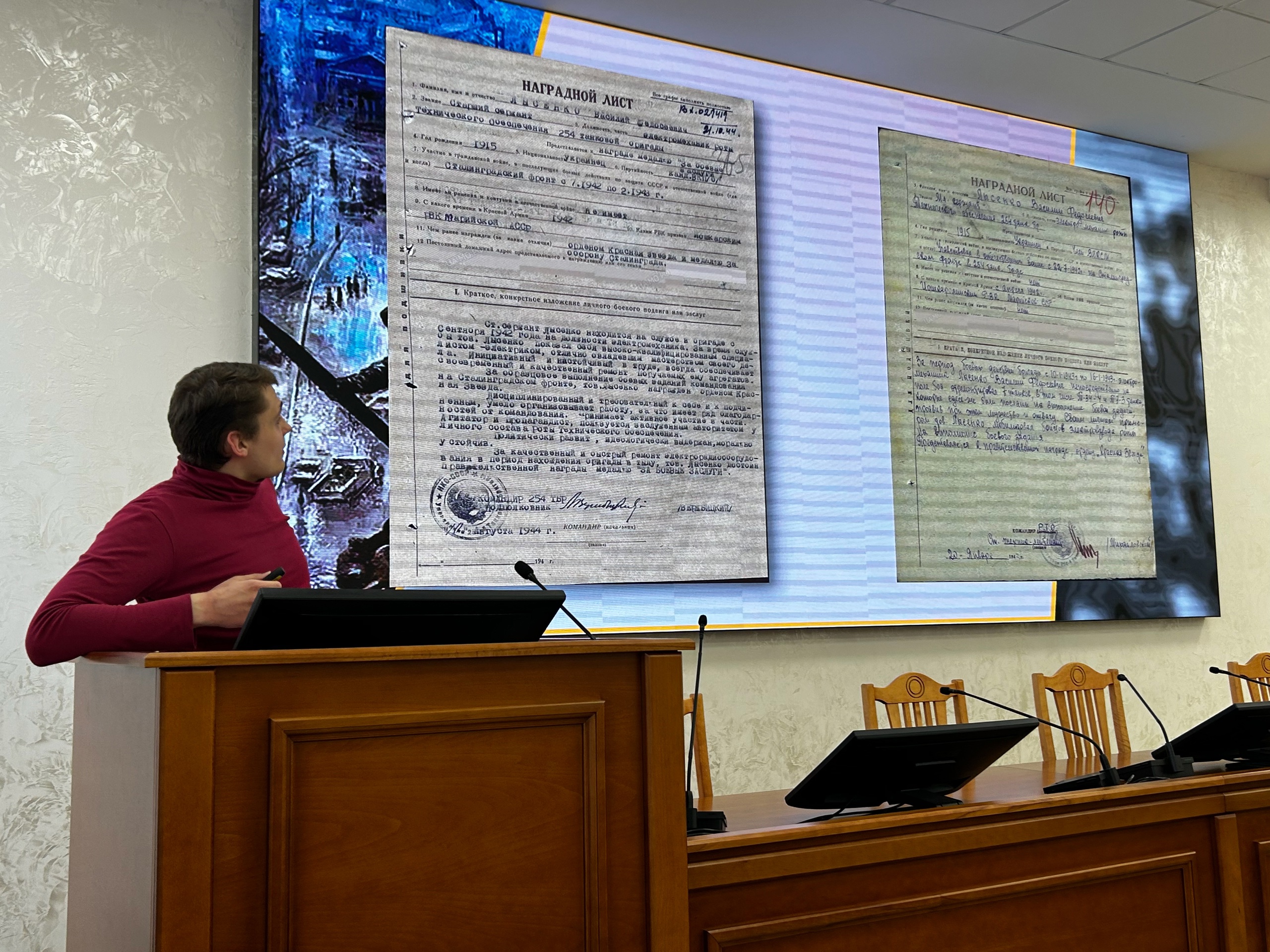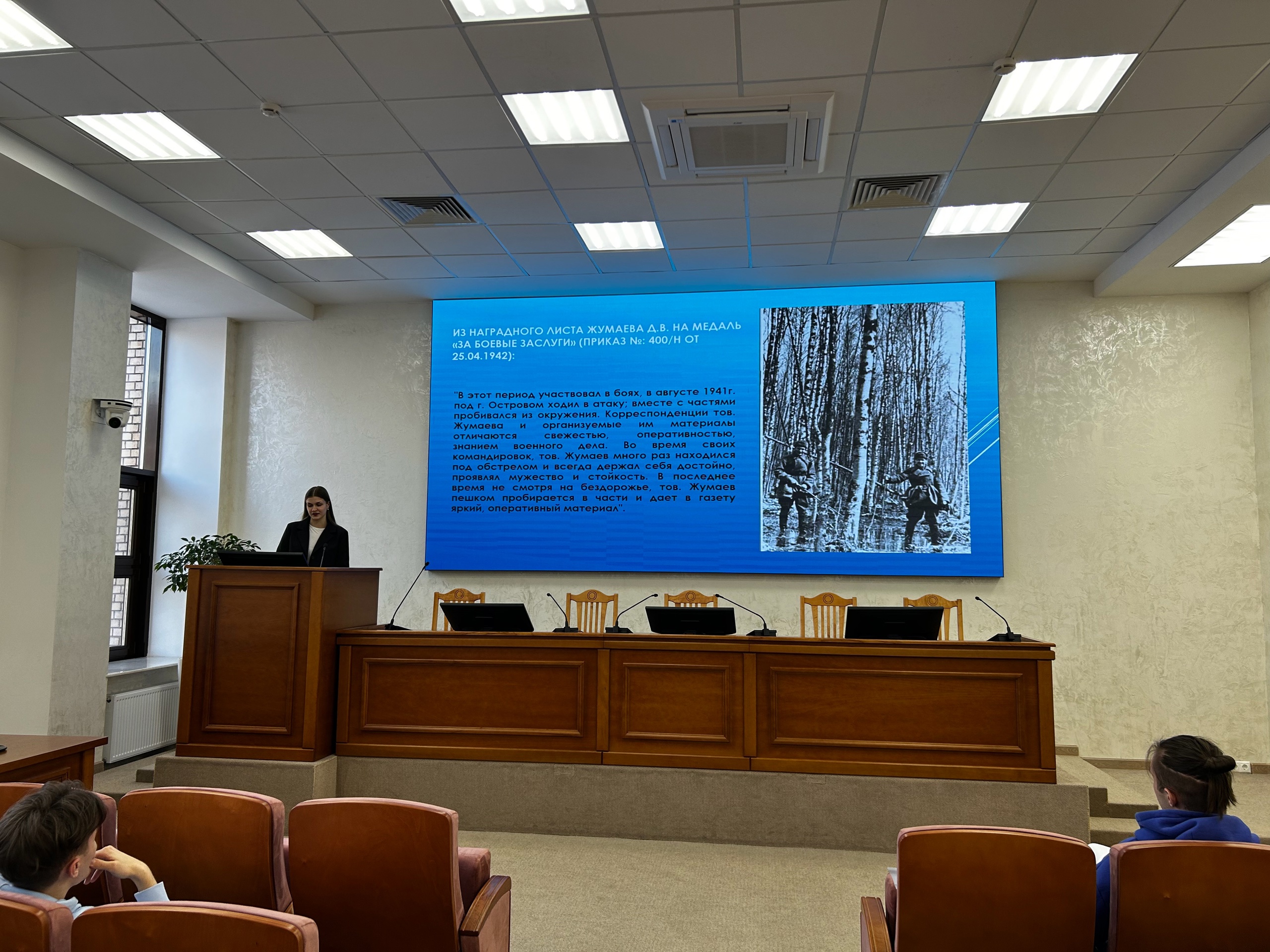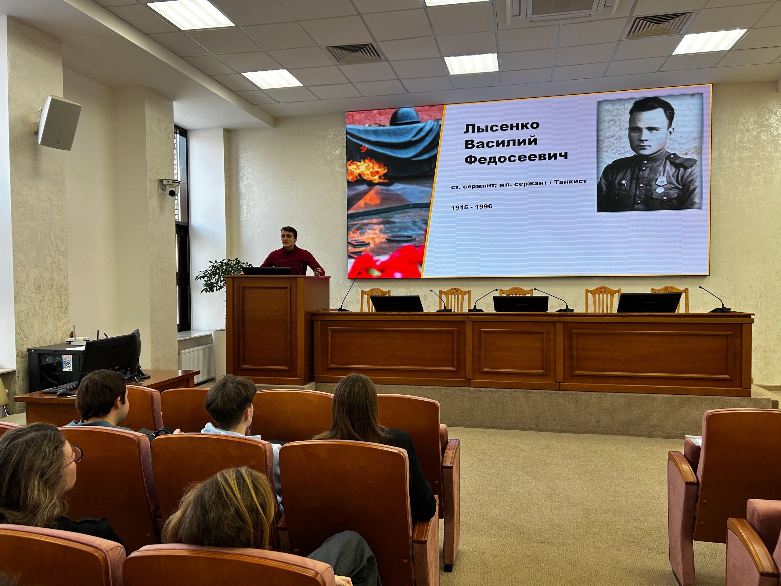 28 Февраль / 2025Студенты рассказали о прадедах, участвовавших в Сталинградской битве, битве под Москвой, освобождении Европы. Студент 4 курса Опаленов Данила показал сохранившиеся наградные листы своего прадеда. Жумаева Василиса включила в доклад архивные фотографии и письма своего прадедушки и прабабушки. Абашин Федор рассказал о подвигах и непростой судьбе своих родственников, участвовавших в Великой Отечественной Войне. В ходе встречи вспоминали и действующих военнослужащих. Этот день стал мостом между поколениями, напомнив, что мужество и любовь к Родине не имеют временных границ.