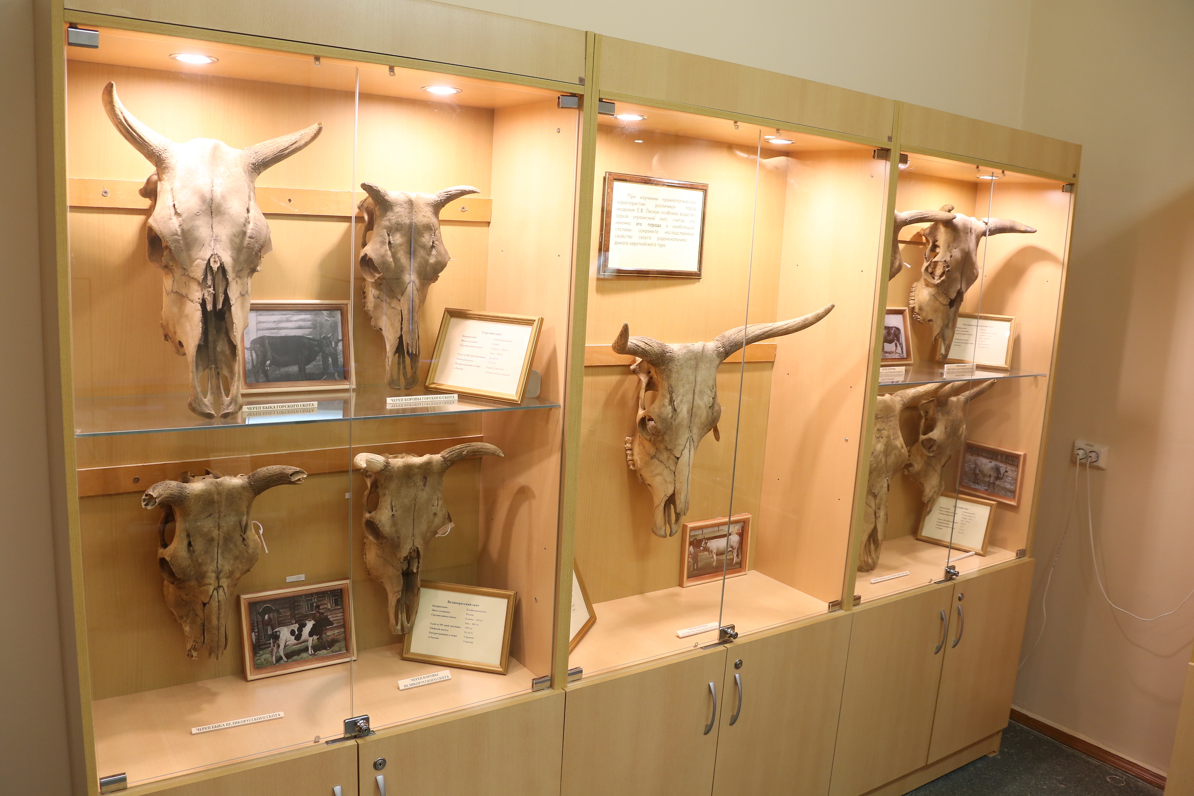 В основу экспозиции музея вошли краниологическая и остеологическая коллекции различных видов животных: черепа и скелеты крупного рогатого скота, лошадей, свиней, овец, зубров, буйволов, бизонов, верблюдов, собак. Экспонаты были собраны и переданы в дар Тимирязевке выдающимся ученым-животноводом, одним из основоположников зоотехнической науки - основателем русской краниологии, учеником профессора М.И. Придорогина, создателем научно-педагогической школы по скотоводству, академиком Ефимом Федотовичем Лискуном (1873-1958).