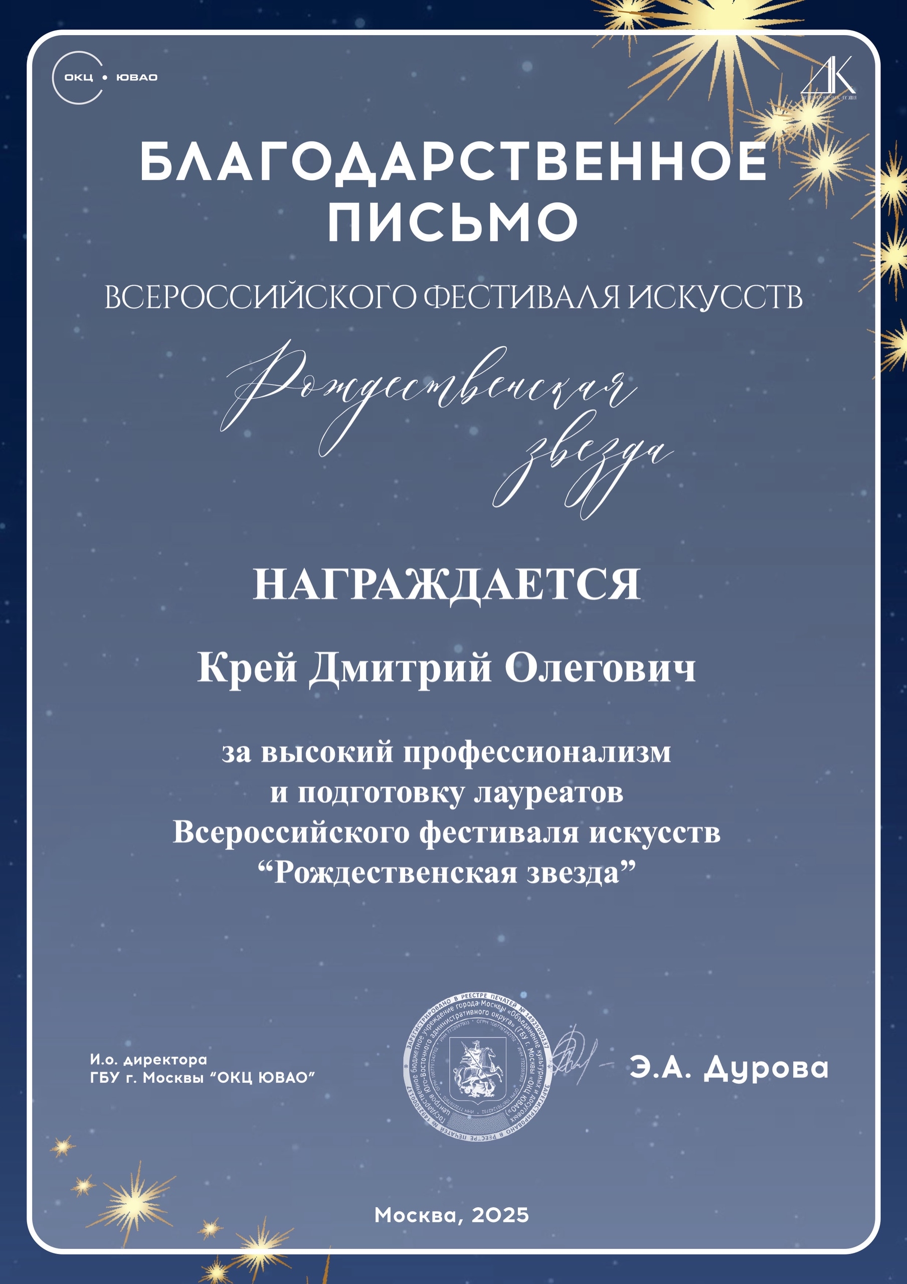 Помимо победы ансамбля, художественный руководитель Дмитрий Крей был удостоен Благодарственного письма за высокий профессионализм и отличную подготовку участников к фестивалю.