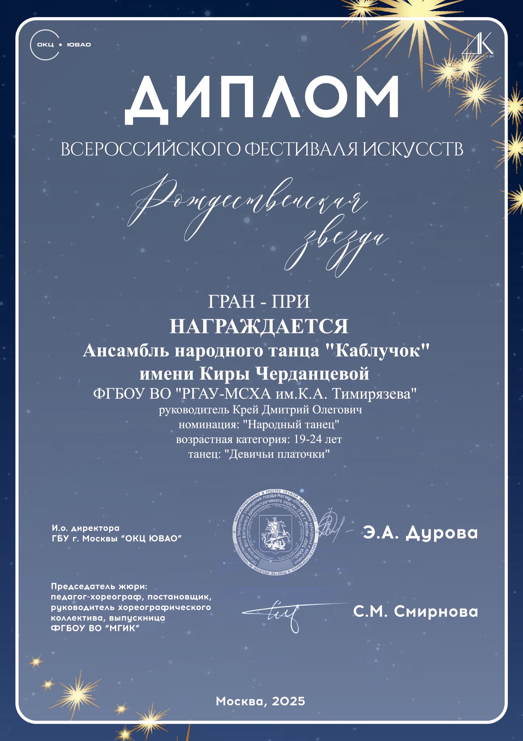 Также ансамбль народного танца «Каблучок» стал обладателем ГРАН-ПРИ Всероссийского фестиваля искусств «Рождественская звезда», который прошёл в ДК Капотня города Москвы. Это высшая награда фестиваля, подтверждающая высокий уровень мастерства и талант коллектива.