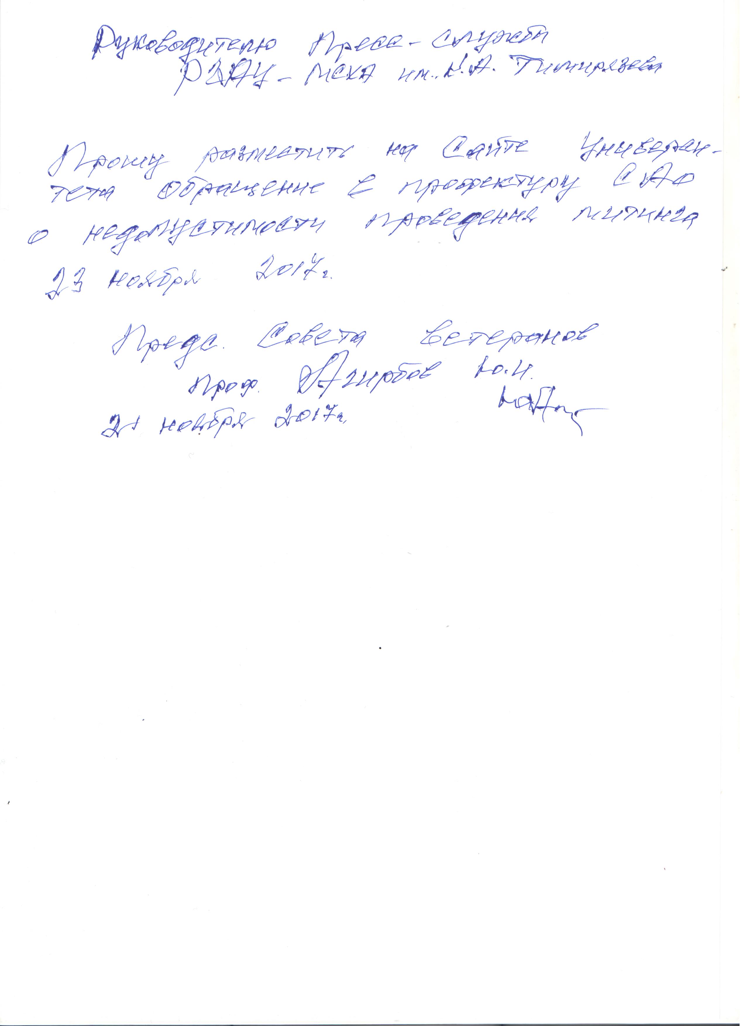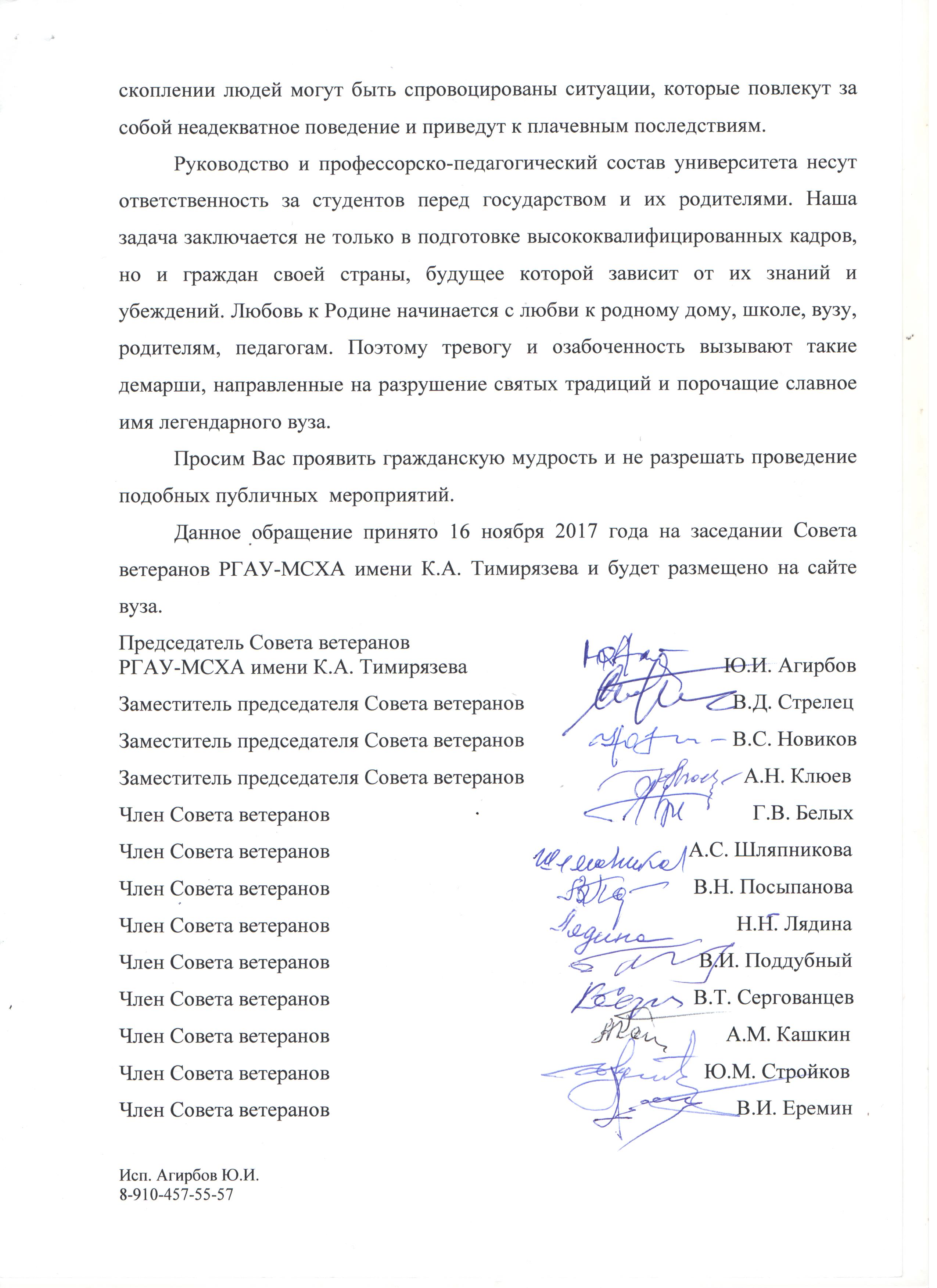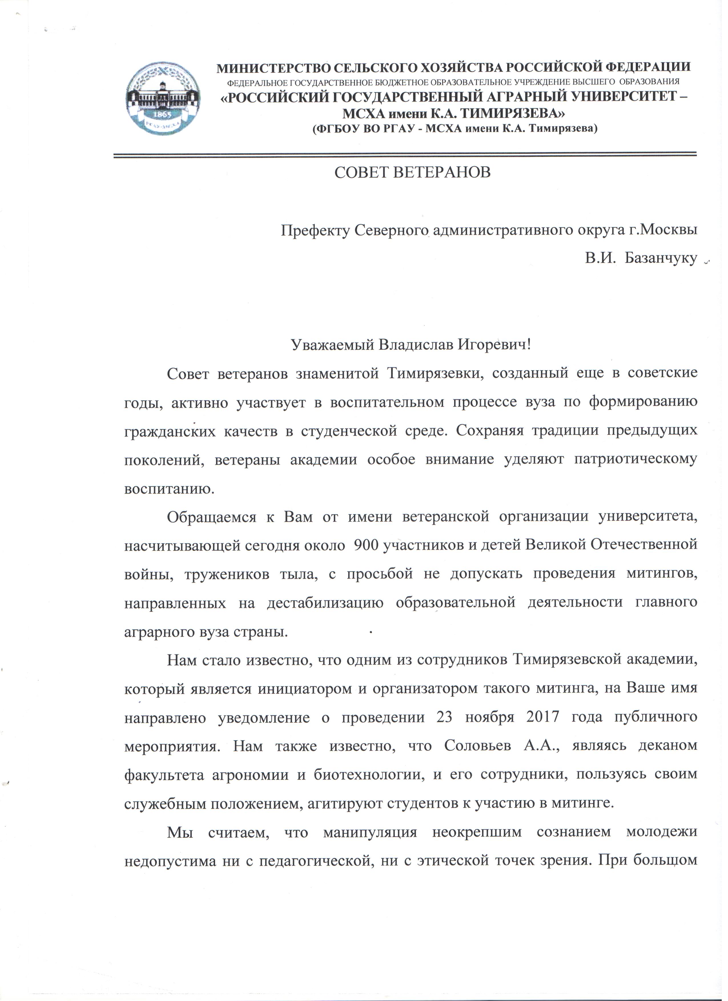 Ветераны университета обратились с просьбой к префекту Северного административного округа В.И. Базанчуку не допускать проведения митингов, направленных на дестабилизацию образовательной деятельности главного аграрного вуза страны.