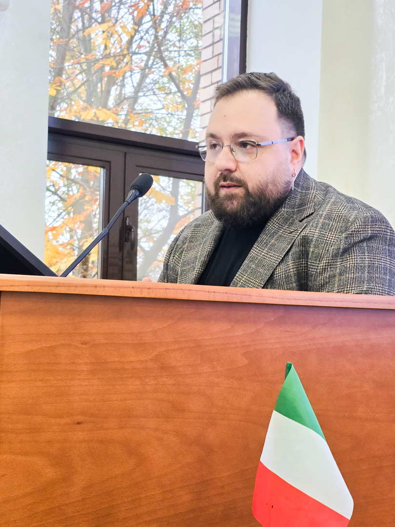 05 Ноябрь / 2025С видеопоздравлением к участникам обратилась Марта Корона, переводчик и выпускница университета г. Удине (Италия), тепло поприветствовав студентов и преподавателей. С приветственным словом выступил заведующий кафедрой иностранных и русского языков, Алексей Анатольевич Зайцев, подчеркнув важность изучения иностранных языков и межкультурного диалога.