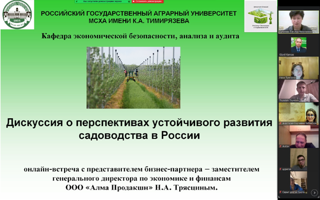 Студенты и преподаватели Института экономики и управления АПК провели онлайн-встречу с представителем ведущего компании-производителя яблок премиум-качества – заместителем генерального директора по экономике и финансам ООО «Алма Продакшн» Никитой Антоновичем Трясциным. Ее ключевой темой стала оценка роли продукции садоводства в обеспечении продовольственной и экономической безопасности в России.