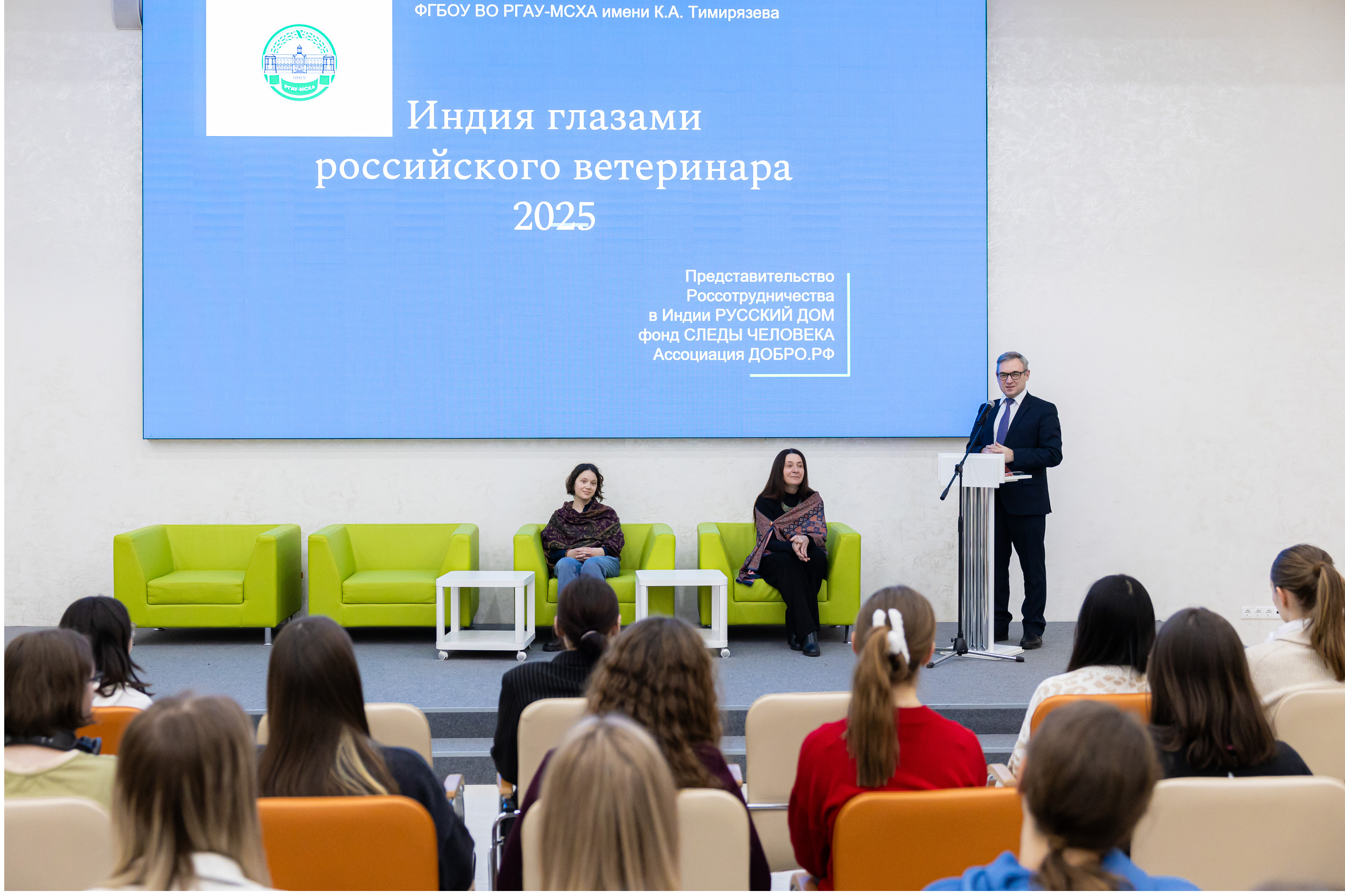В РГАУ-МСХА имени К.А. Тимирязева дан старт циклу профессиональных лекций «Индия глазами российского ветеринара», посвященному участию сотрудников и студентов академии в международном проекте Россотрудничества «Миссия Добро». Лекции проводит доцент кафедры физиологии, этологии и биохимии животных Светлана Карамушкина, делясь уникальным опытом работы с крупным рогатым скотом (КРС) в Индии.