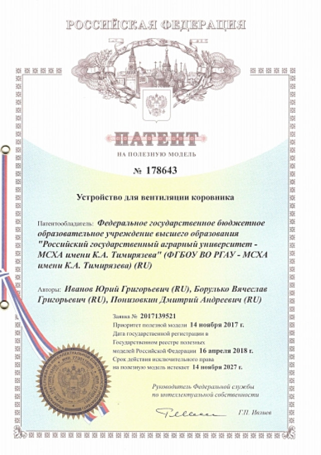 В прошлом году за эту инновацию тимирязевцы получили серебряную медаль на агропромышленной выставке «Золотая осень». Сейчас решили усовершенствовать конструкцию вентиляторов, чтобы они могли охлаждать воздух не только с помощью его интенсивной циркуляции, но и с помощью искусственного тумана. Сотрудники кафедры автоматизации и механизации животноводства: доцент Вячеслав Борулько, профессор, доктор технических наук Юрий Иванов, кандидат технический наук Дмитрий Понизовкин получили патент на это устройство.