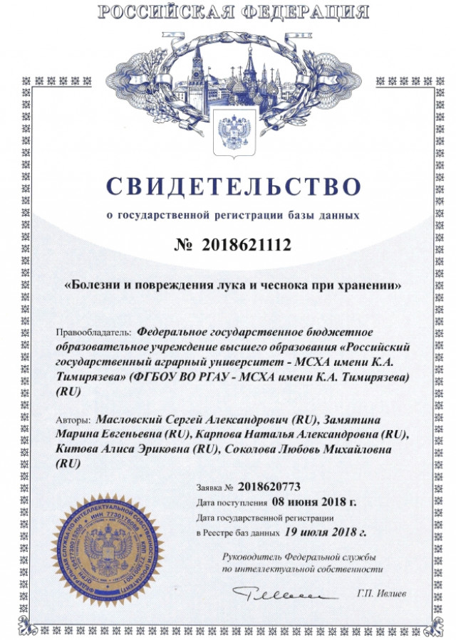 13 Август / 2018Тимирязевцы Сергей Масловский, Марина Замятина, Наталья Карпова, Алиса Китова и старший научный сотрудник лаборатории селекции столовых корнеплодов и луков ВНИИО – филиала ФГБНУ ФНЦО Любовь Соколова получили свидетельства о регистрации баз данных «Болезни и повреждения картофеля при хранении», «Болезни и повреждения лука и чеснока при хранении» и «Болезни и повреждения капусты при хранении».