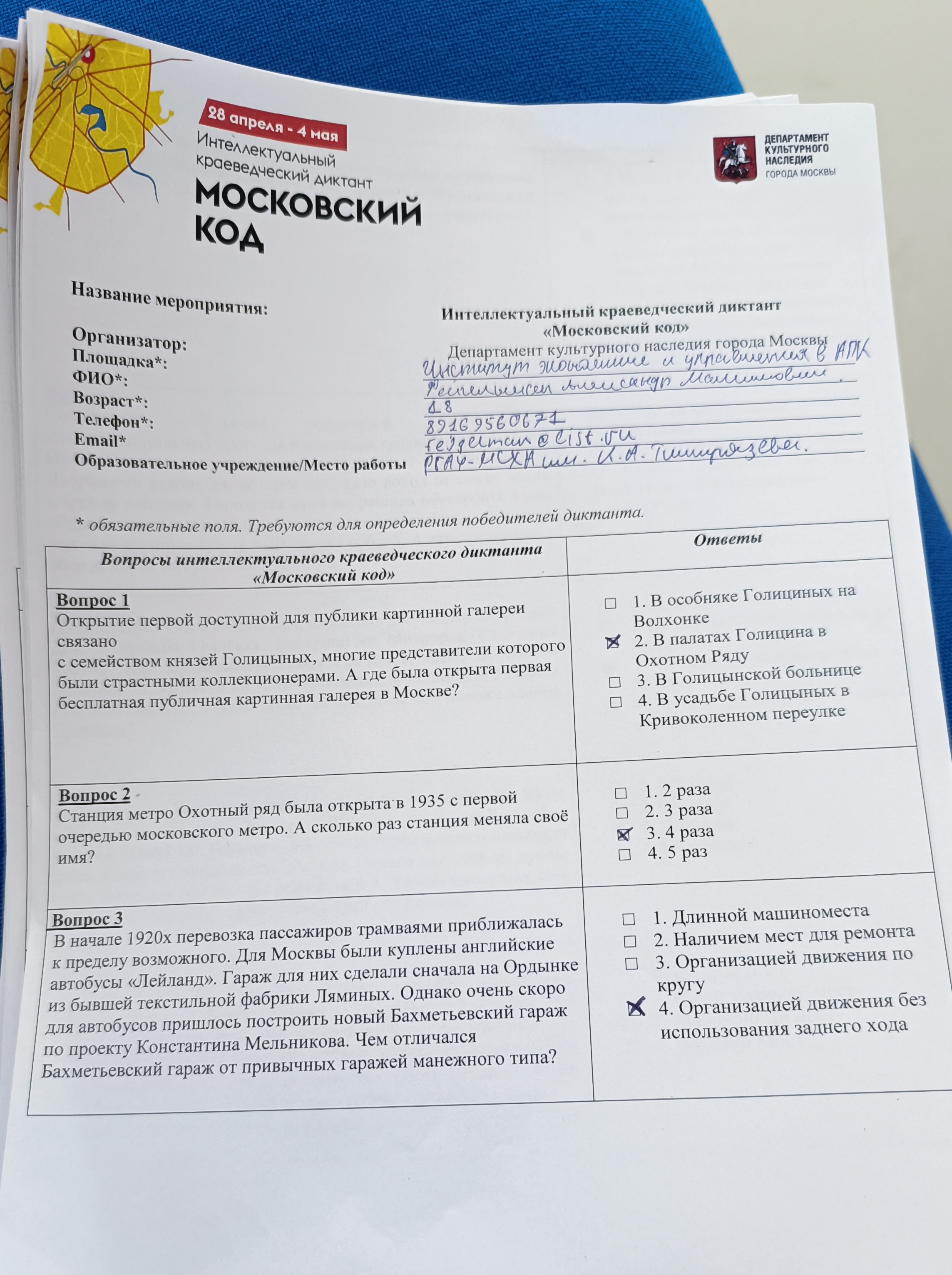 27 Май / 2024«Московский код» – так называется краеведческий диктант, организаторами проведения которого наряду с Управлением молодежной политики и воспитательной деятельности выступили преподаватели кафедры истории Л.В. Блонский, Е.И. Гончарук, И.А. Миролюбов, В.Т. Сакаев во главе с заведующим кафедрой истории А.Б. Оришевым. В его написании приняли участие не только наши студенты, но и преподаватели. Традиционно диктант состоял из 20 вопросов на тему истории и архитектуры столицы. Всего специалисты Мосгорнаследия совместно с краеведами составили около 100 вопросов для различных категорий, на которые предстояло ответить нашим студентам и преподавателям. Каждый участник в качестве сувенира получил авторучку и значок участника акции.