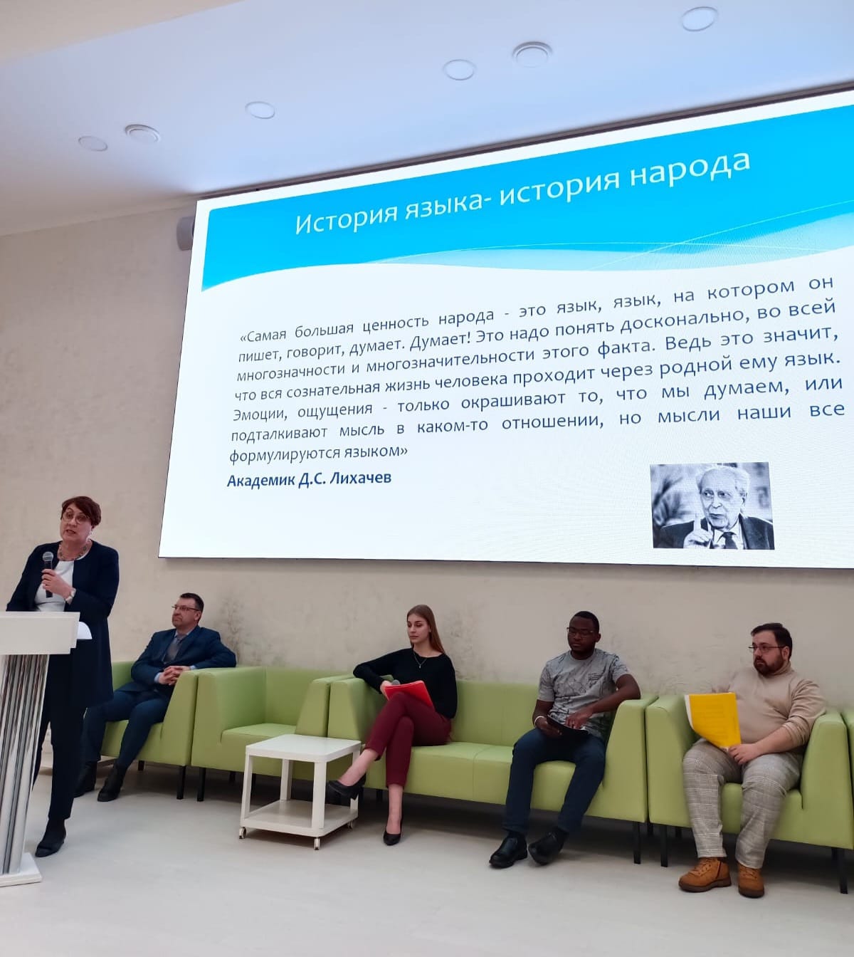 Спикеры дискуссии: и.о. заведующего кафедрой иностранных и русского языков Алексей Анатольевич Зайцев и и.о. заведующего кафедрой связей с общественностью и речевой коммуникации Елена Валерьевна Гнездилова - рассказали об истории и особенностях развития иностранных и русского языков. В ходе обсуждения были затронуты такие проблемы современного русского литературного языка, как использование иностранных слов, упрощение и подверженность языка внешним влияниям. В дискуссии приняли участие студенты, преподаватели и приглашенные гости.
