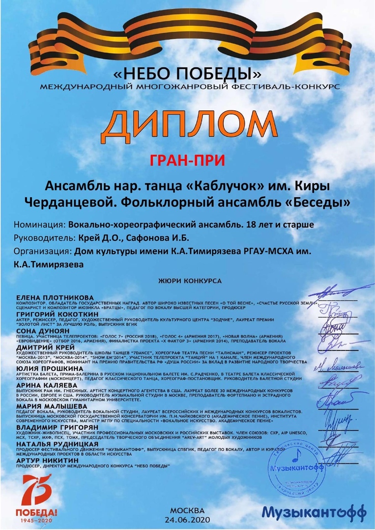 21 Июль / 2020Ансамбль народного танца «Каблучок» имени К.П. Черданцевой и фольклорный ансамбль «Беседы» приняли совместное участие в Международном многожанровом фестивале-конкурсе «Небо победы», посвящённом 75-летию победы в Великой Отечественной войне. Событие состоялось под эгидой творческого центра «Музыкантофф».