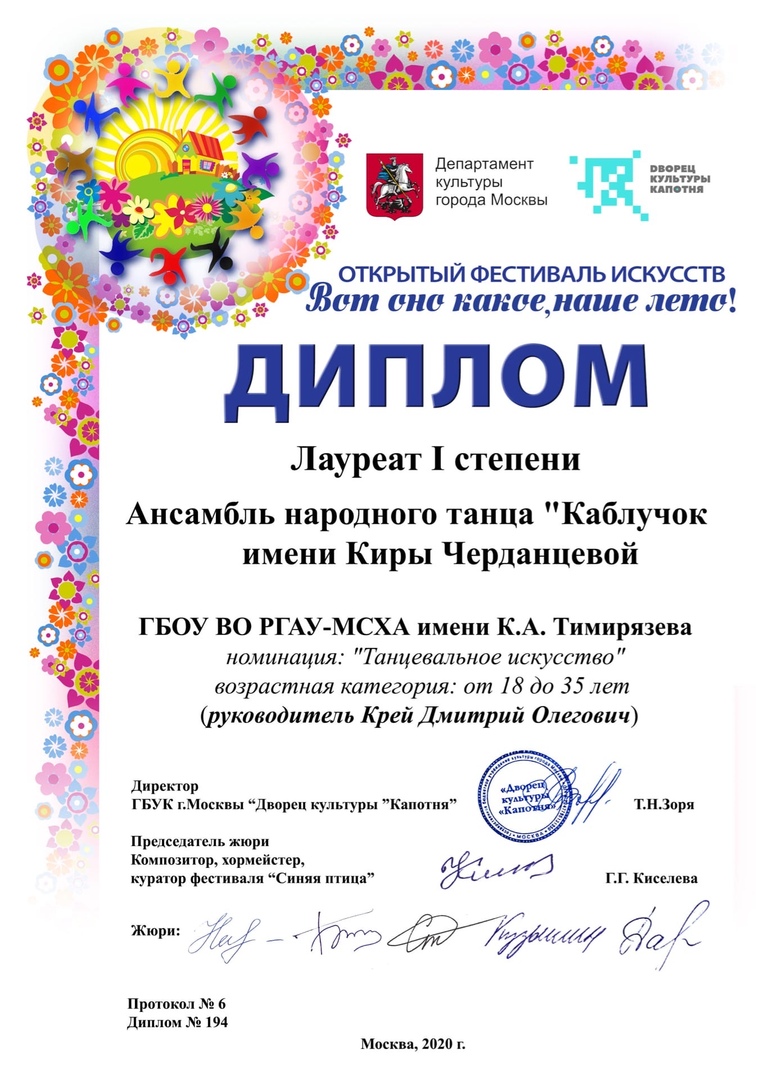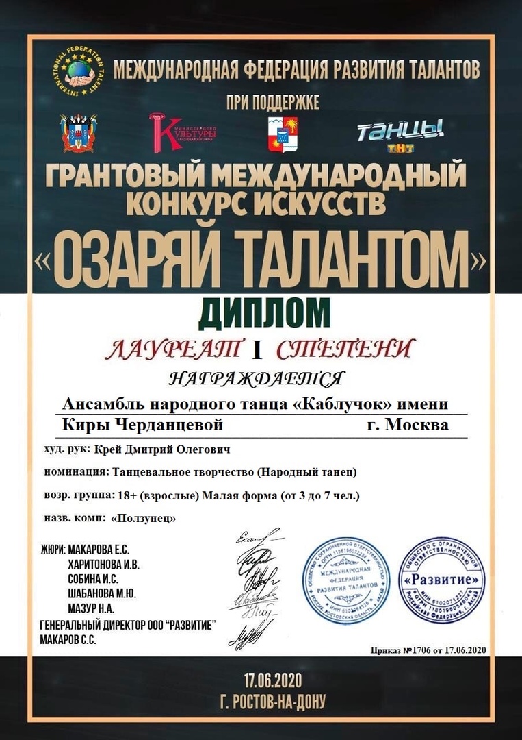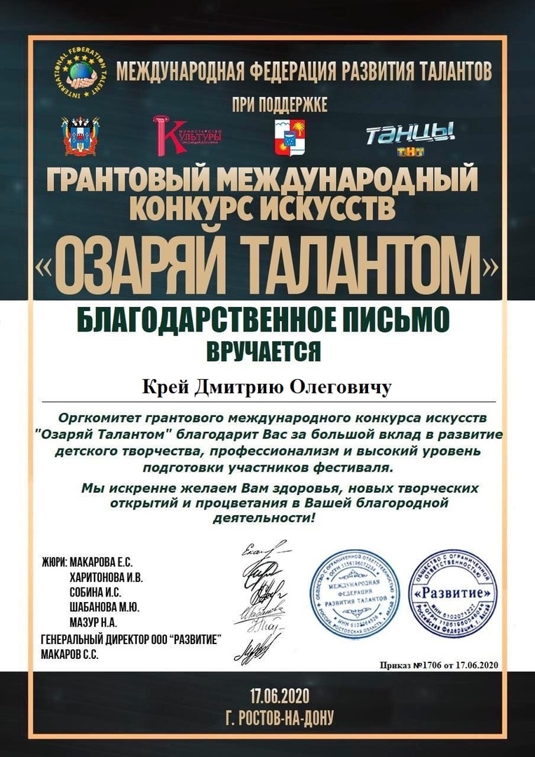 За большой вклад в развитие народного творчества, профессионализм и высокий уровень подготовки участников фестиваля руководитель ансамбля «Каблучок» Д.О. Крей отмечен Благодарственным письмом от организаторов конкурса.