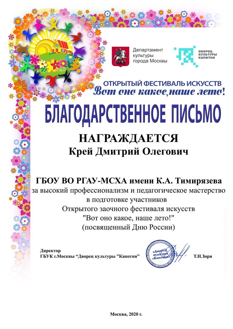Руководитель ансамбля за высокий профессионализм и педагогическое мастерство в подготовке артистов к фестивалю был награждён Благодарственным письмом от директора Дворца культуры «Капотня» Т.Н. Зори.