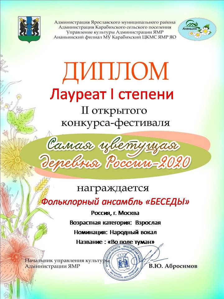 Фольклорный ансамбль «Беседы» представил первоклассное выступление в рамках II открытого конкурса-фестиваля «Самая цветущая деревня России – 2020». Участие в нем принимали более трёхсот исполнителей со всей России. Конкурс-фестиваль включал 4 номинации: хореография, вокал, театральное творчество, изобразительное и декоративно-прикладное искусство.
