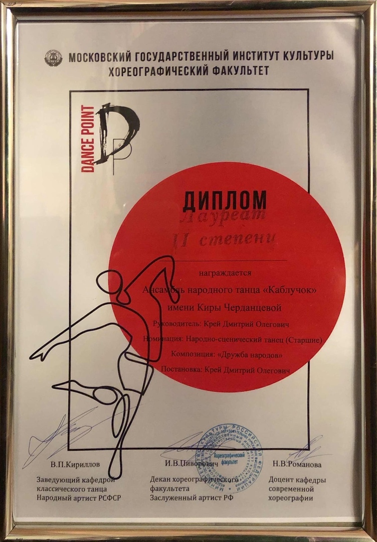 - Для нашего коллектива – это отличный результат, так как в конкурсе принимали участие профессиональные ансамбли народного танца кафедры хореографии МГИК, Казанского государственного института культуры, Орловского государственного института культуры и многих других институтов искусства, - отметил руководитель творческого коллектива Дмитрий Олегович Крей. – Наш коллектив продолжает совершенствовать свой уровень мастерства и двигаться только вперёд!