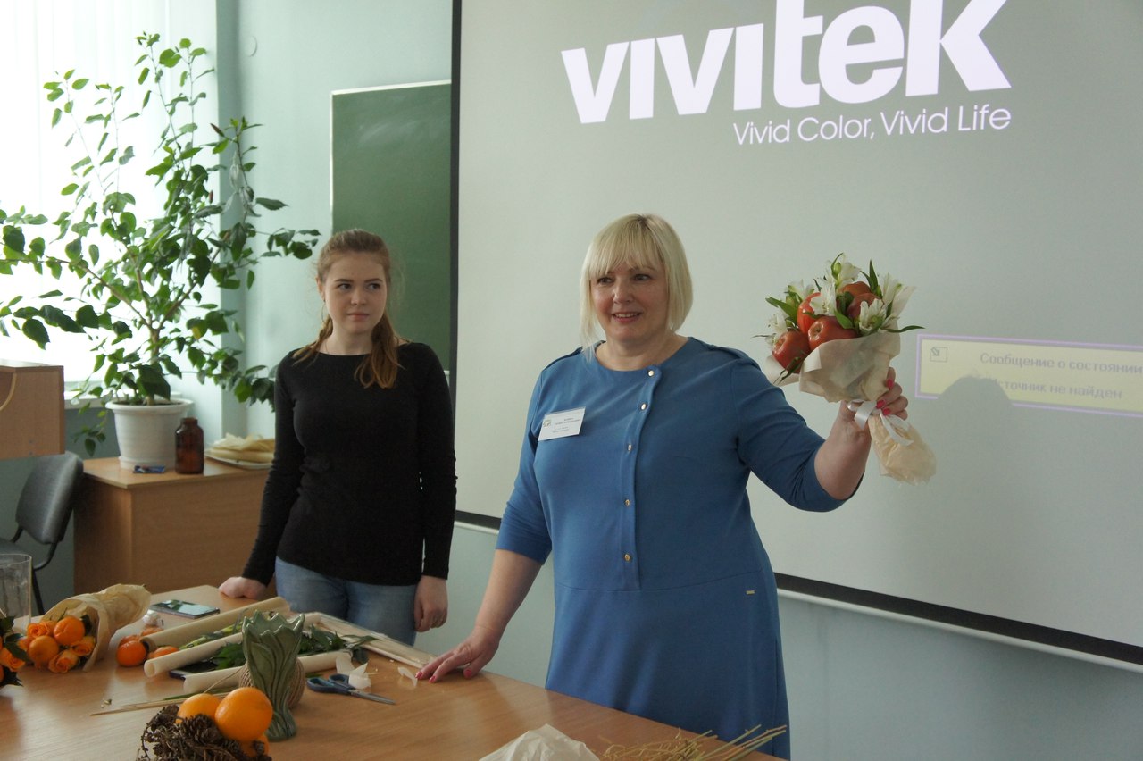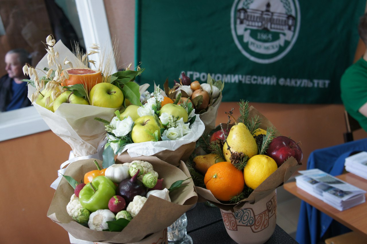 Агрономический факультет свою работу начал с мастер-класса «Флористика. Букеты из плодов и овощей». Авторы использовали в своих композициях чеснок, перец, лук, груши, апельсины и яблоки.