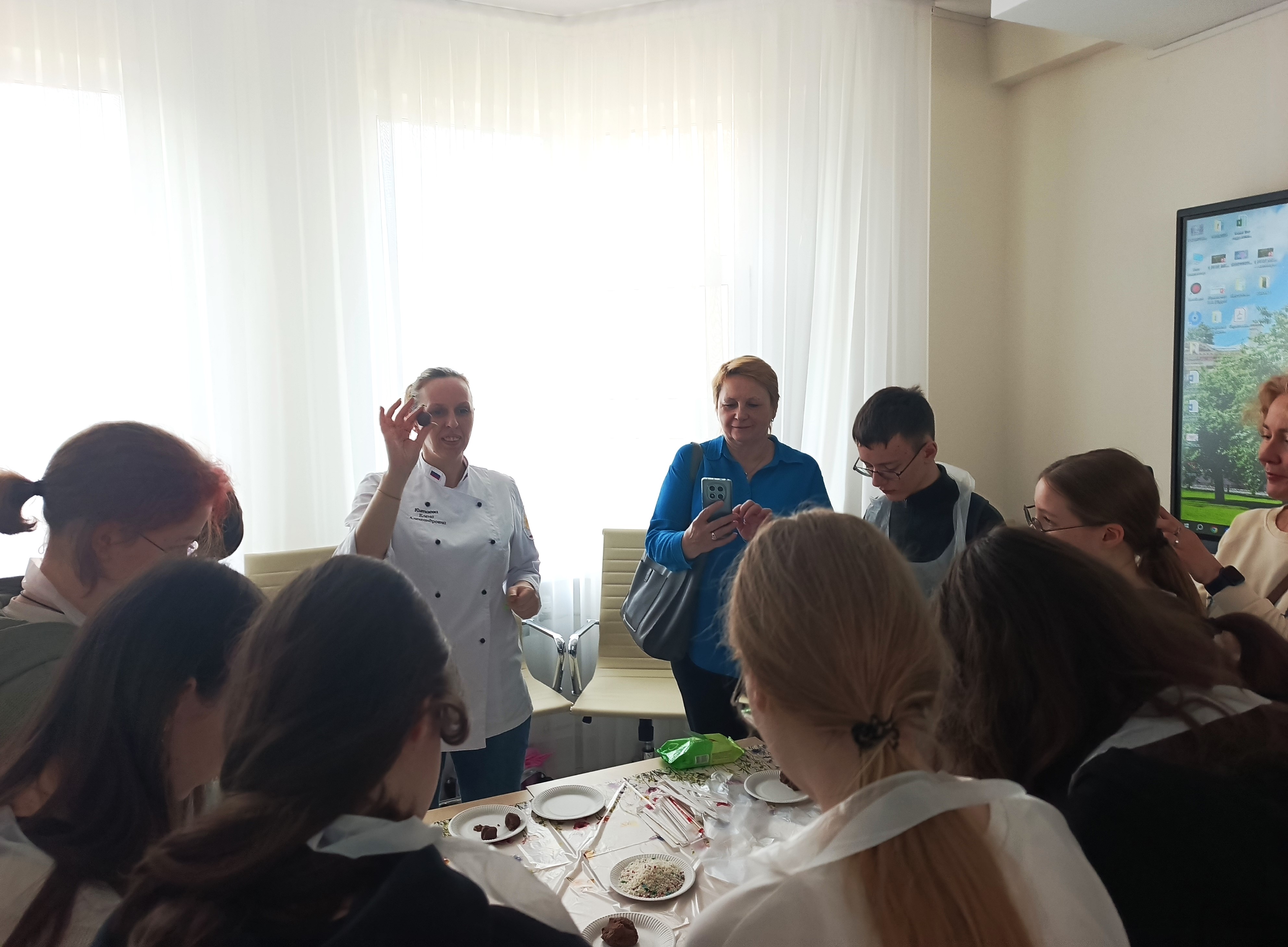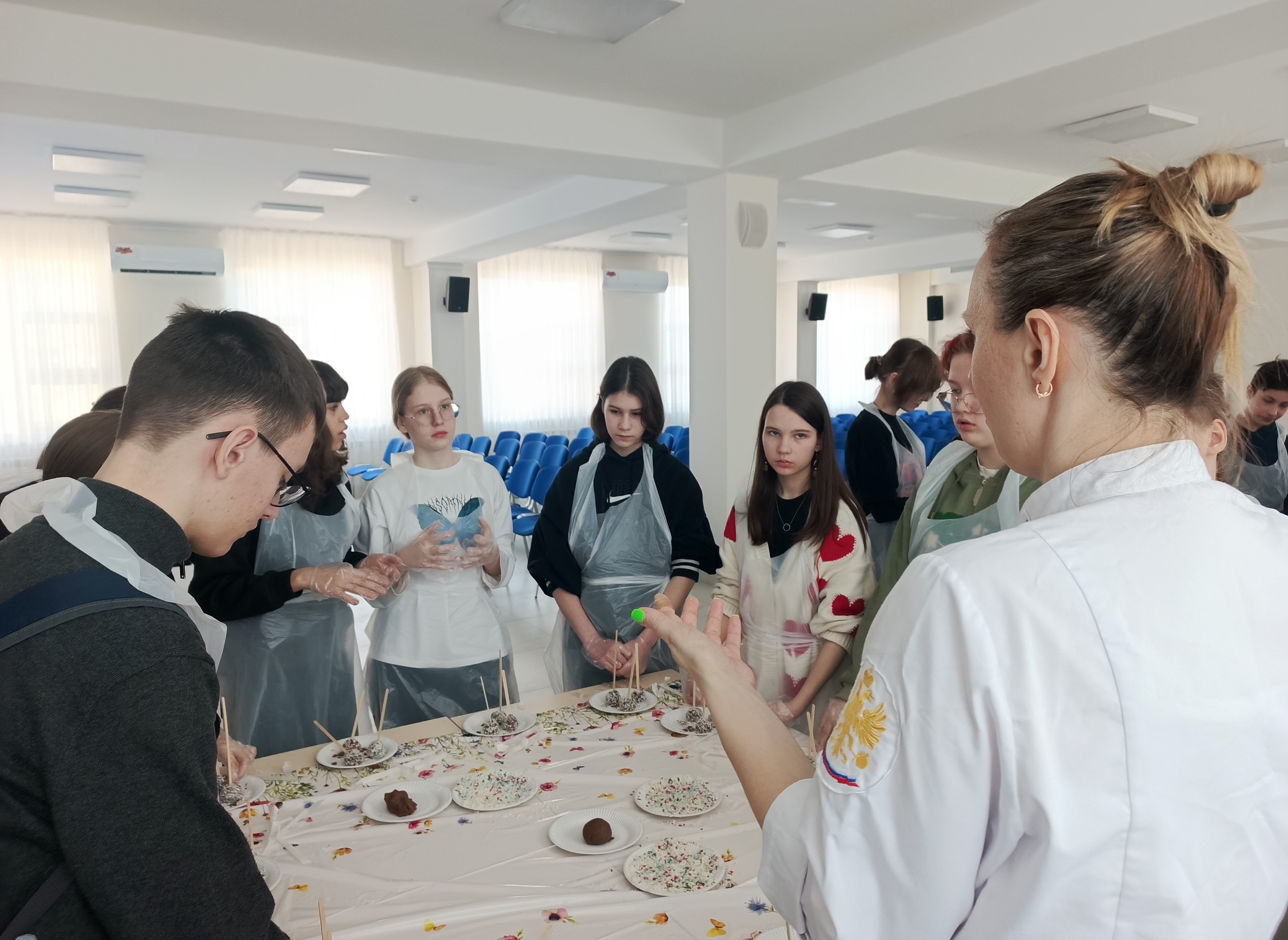 На следующий день ребят ждали занятия по направлению 43.02.15 Поварское и кондитерское дело. Елена Александровна Китаева, заместитель директора по воспитательной работе и преподаватель профильных дисциплин, провела увлекательный и вкусный мастер-класс. Участники научились готовить кейк-попсы, работать с бисквитом, маслом и сгущёнкой, а также подбирать гармоничные вкусовые сочетания.