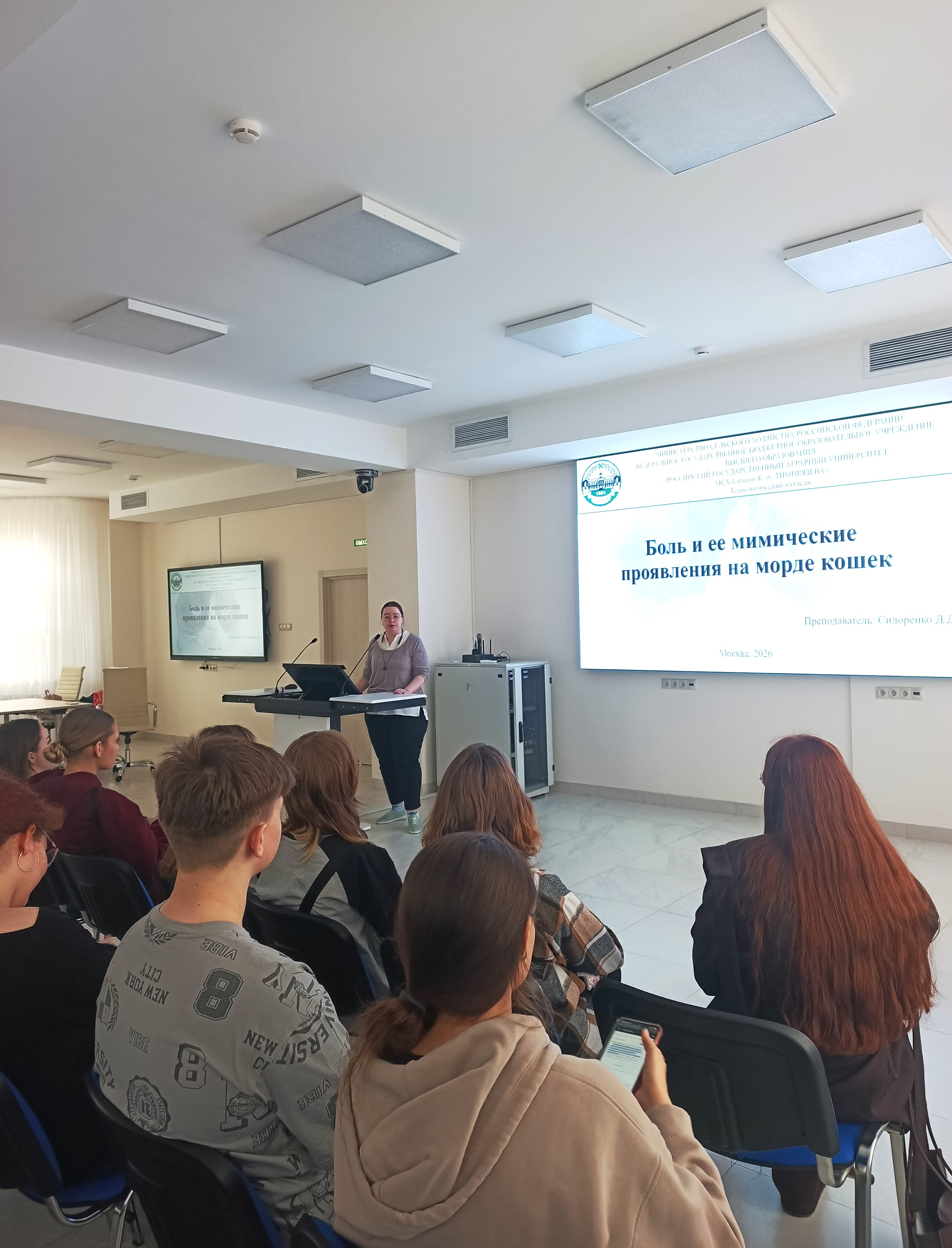 2 апреля Дарья Дмитриевна Сидоренко, преподаватель колледжа, рассказала о специальности 36.02.01 Ветеринария. Она подробно объяснила, как проходит обучение и какие перспективы открываются после поступления в академию. Особое внимание было уделено теме распознавания боли у кошек — участники узнали, как по выражению мордочки животного можно понять, что оно испытывает дискомфорт. Школьники не только слушали теорию, но и самостоятельно попробовали диагностировать состояние питомцев.