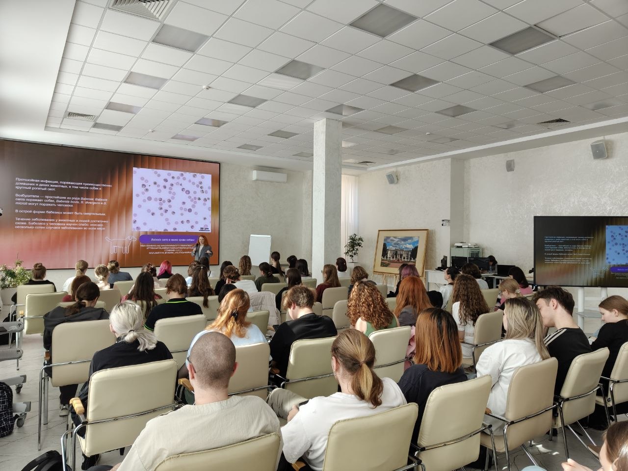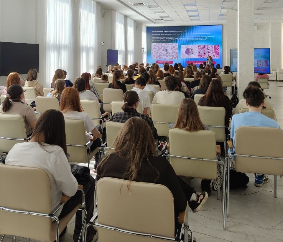 31 Март / 2026Мероприятие собрало большое количество слушателей — студентов направлений подготовки «Ветеринария» и «Биология». Лекцию провела приглашенный спикер — Крупинская Екатерина Сергеевна, биолог ФГБУ «НМИЦ гематологии» и младший научный сотрудник ФГБУ «НИЦЭМ им. Н.Ф. Гамалеи» Минздрава России.