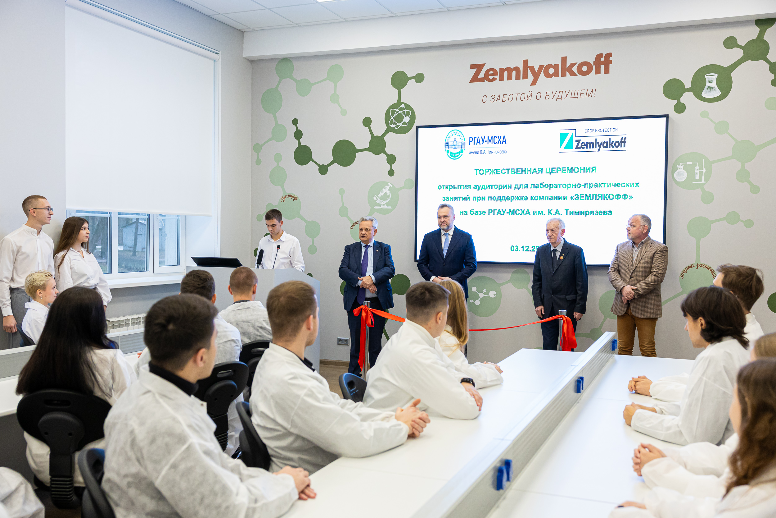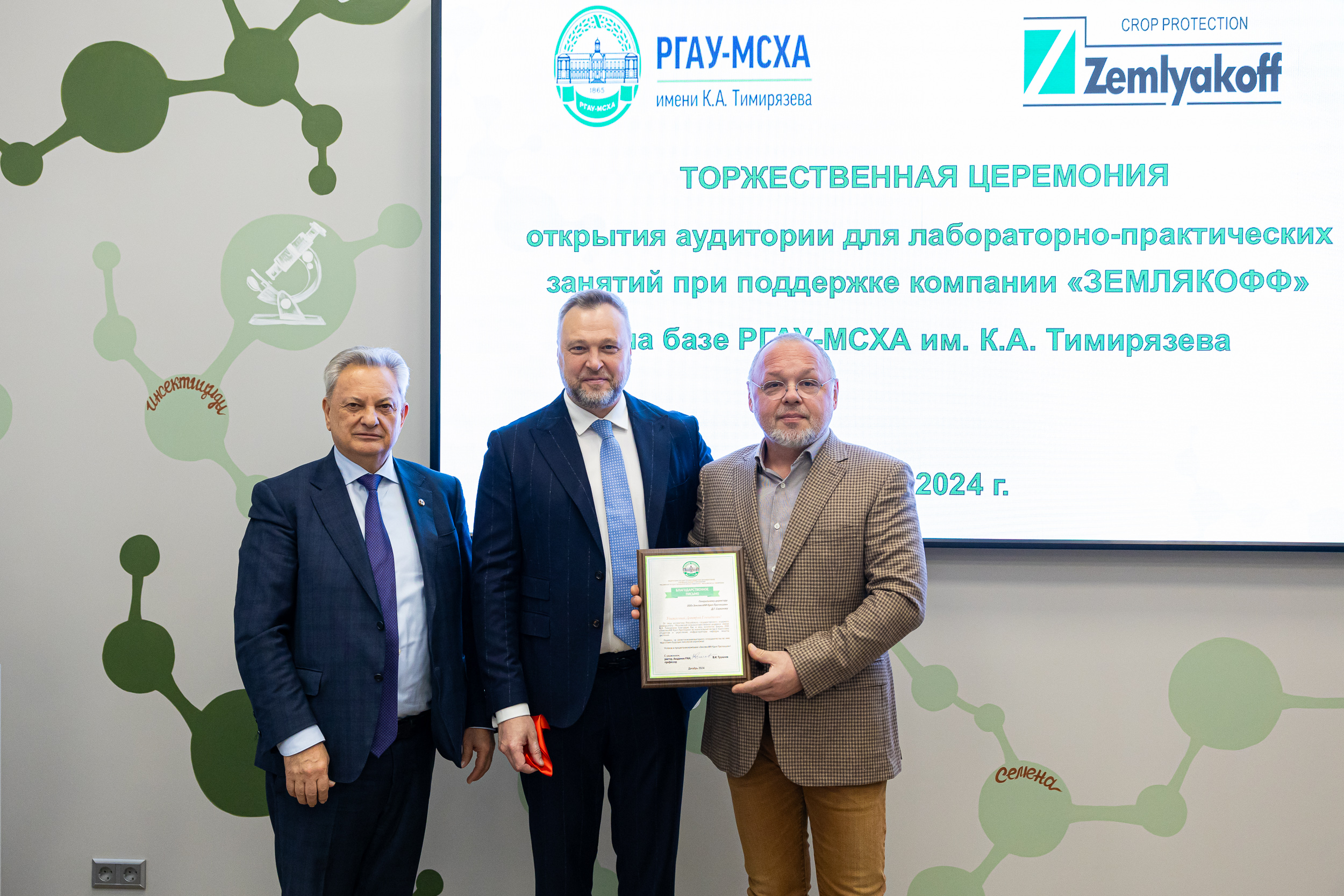 От имени сотрудников, преподавателей и студентов Тимирязевской академии ректор В.И. Трухачев поблагодарил руководство и весь коллектив компании "ЗемлякоФФ" за значительный вклад в подготовку студентов и укрепление инфраструктуры кафедры защиты растений. Он также отметил особый символизм события – открытие новой аудитории совпало с 159-летием университета.