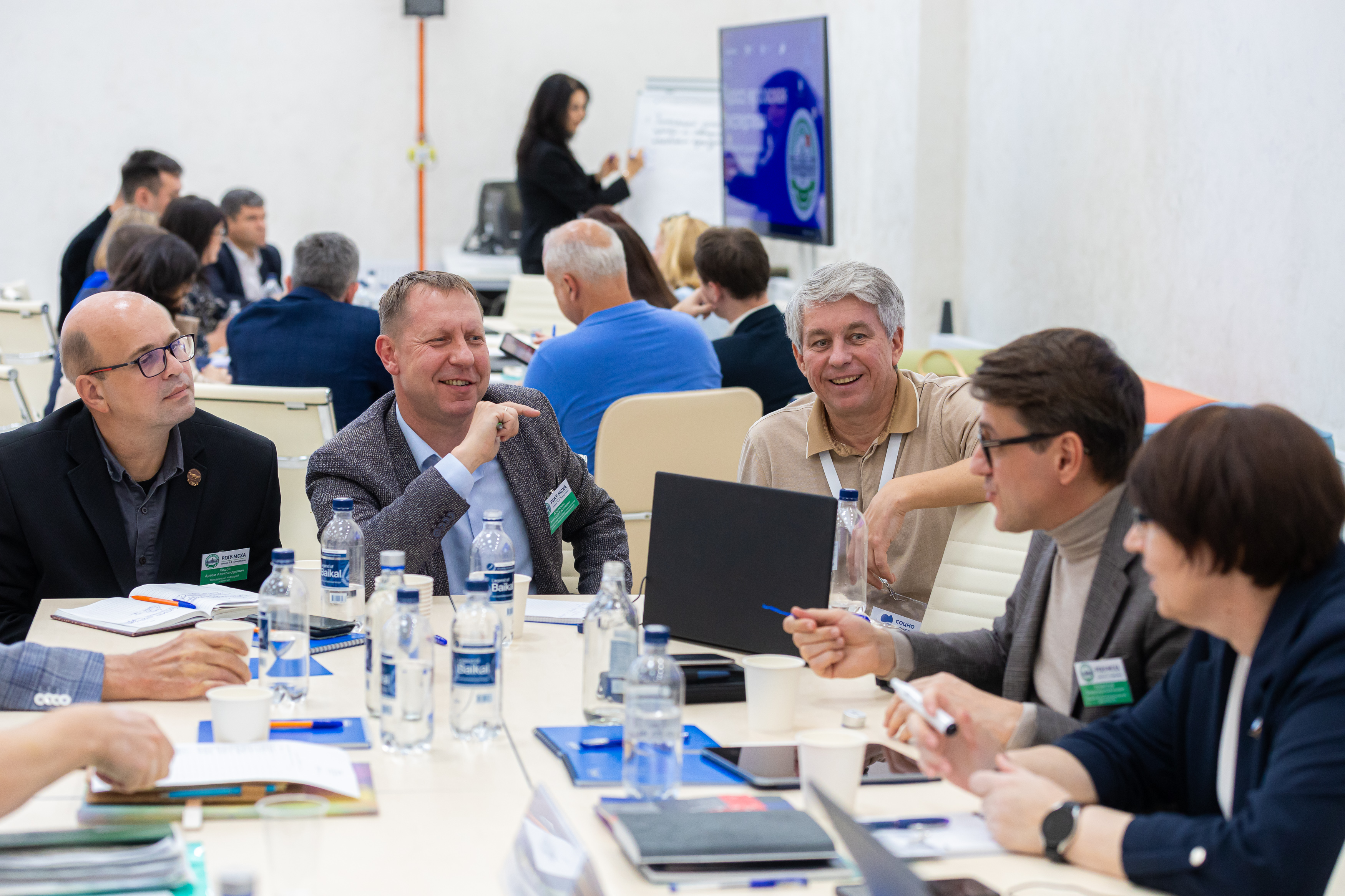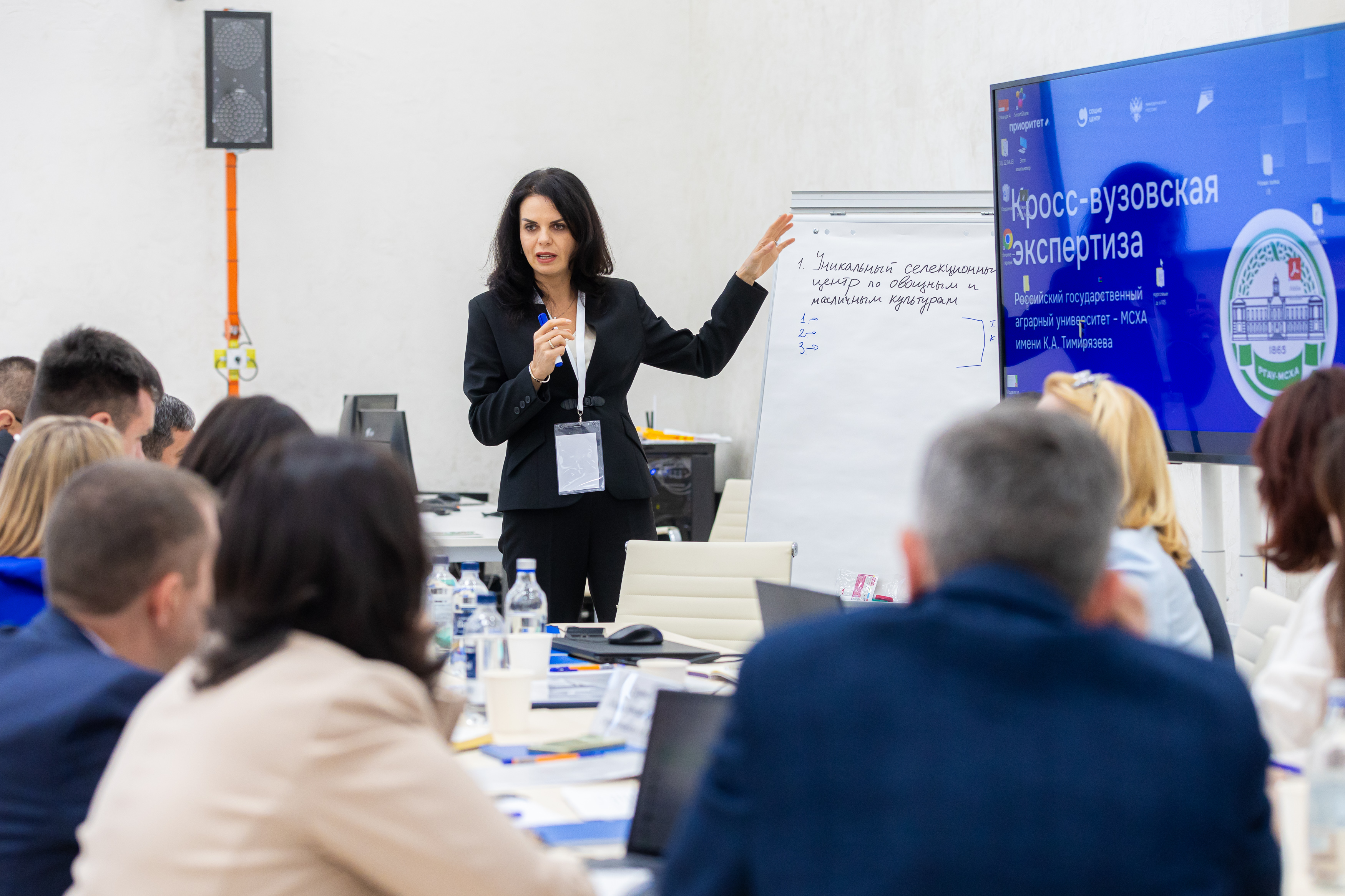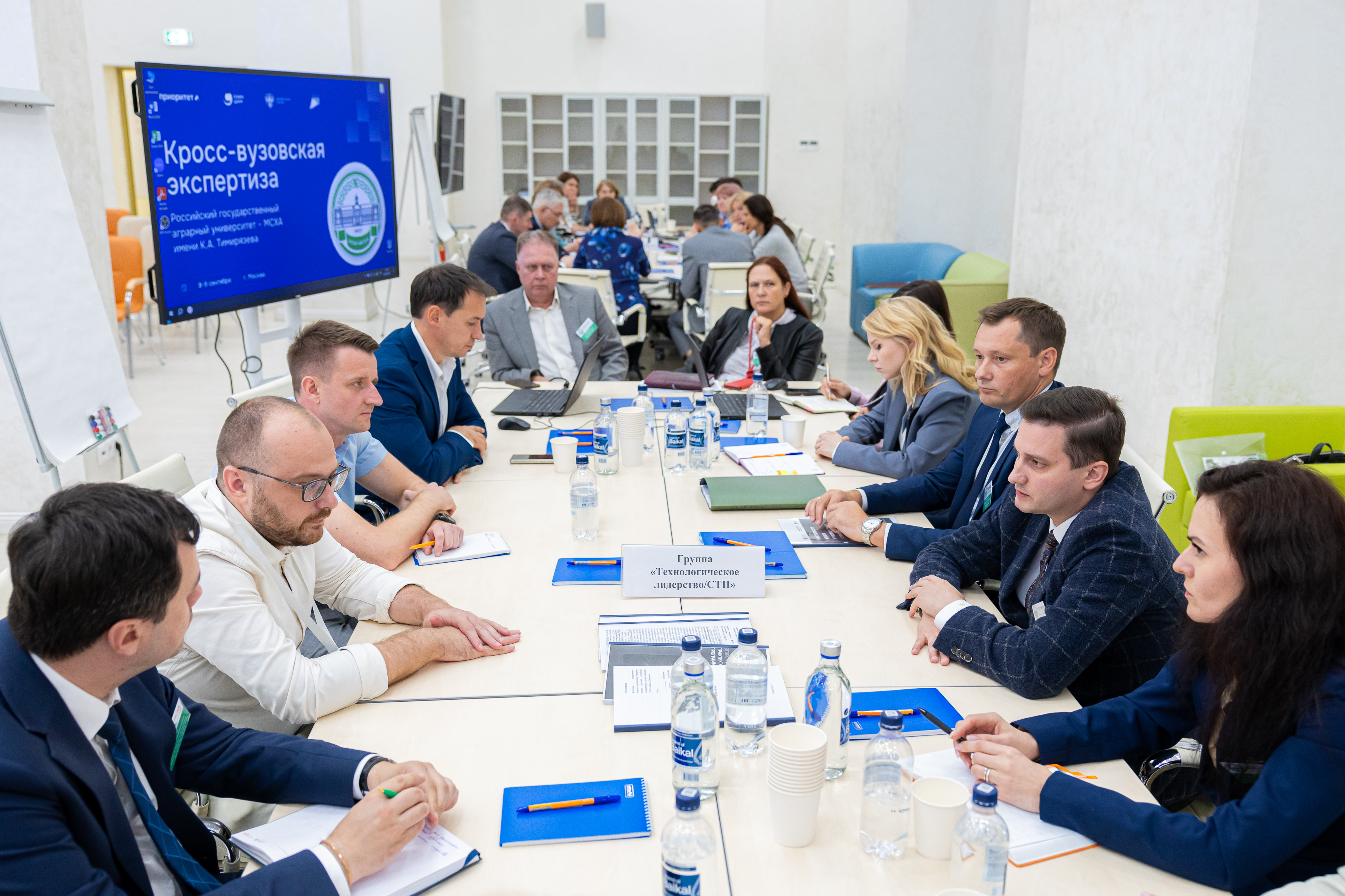 После детального изучения работы лабораторий, эксперты и ученые Тимирязевской академии собрались в Точке кипения «Тимирязевка» для коллективной работы. Ученые Академии представили доклады о текущем состоянии стратегических проектов и обозначили ключевые вызовы. Затем последовала интенсивная работа в группах, нацеленная на командное осмысление заявленных треков. Основной задачей этой сессии стало понимание и обозначение глубинного среза проблем, а также поиск инновационных решений для дальнейшего развития Тимирязевки в рамках программы «Приоритет 2030».