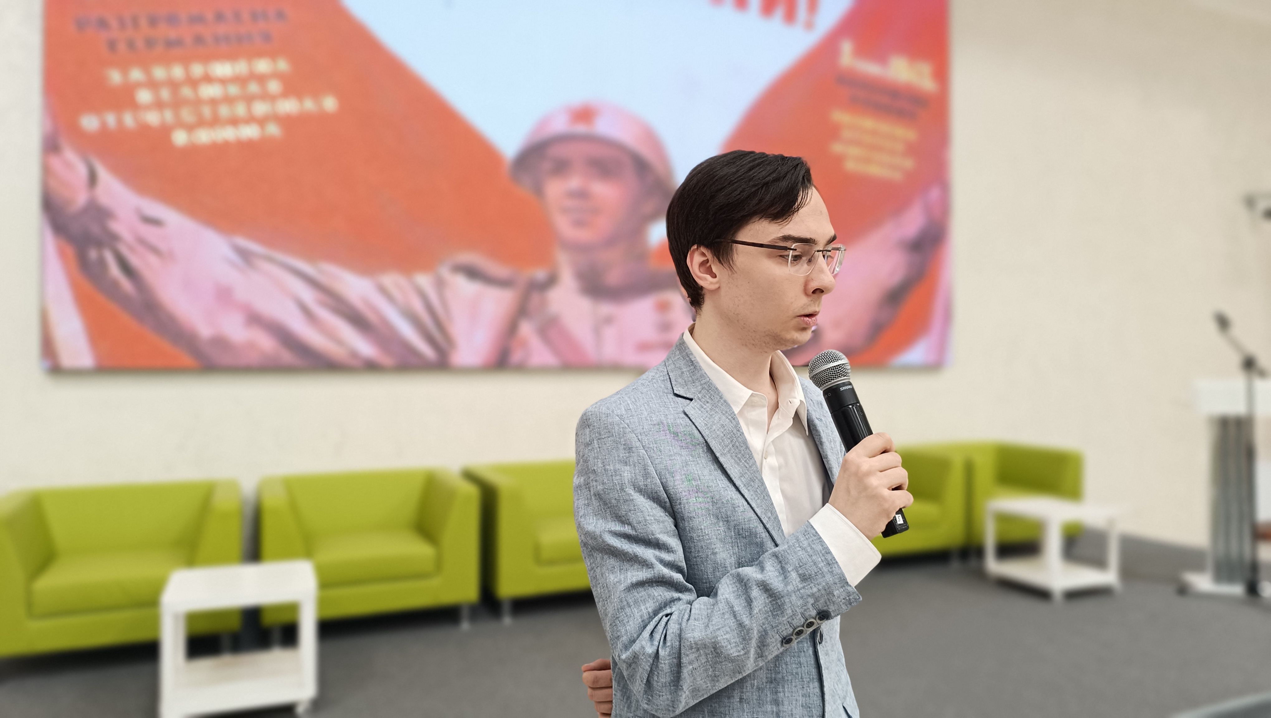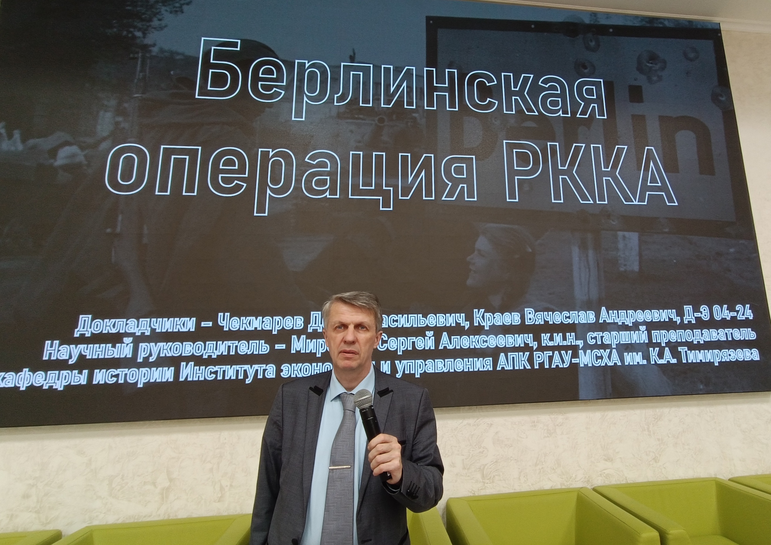 С.М. Миронюк как руководитель Совета молодых ученых и специалистов ИЭиУ АПК (по гуманитарному направлению) отметил интерес студентов к событиям Великой Отечественной войны и отдельно раскрыл значение разгрома Германии Советским Союзом.