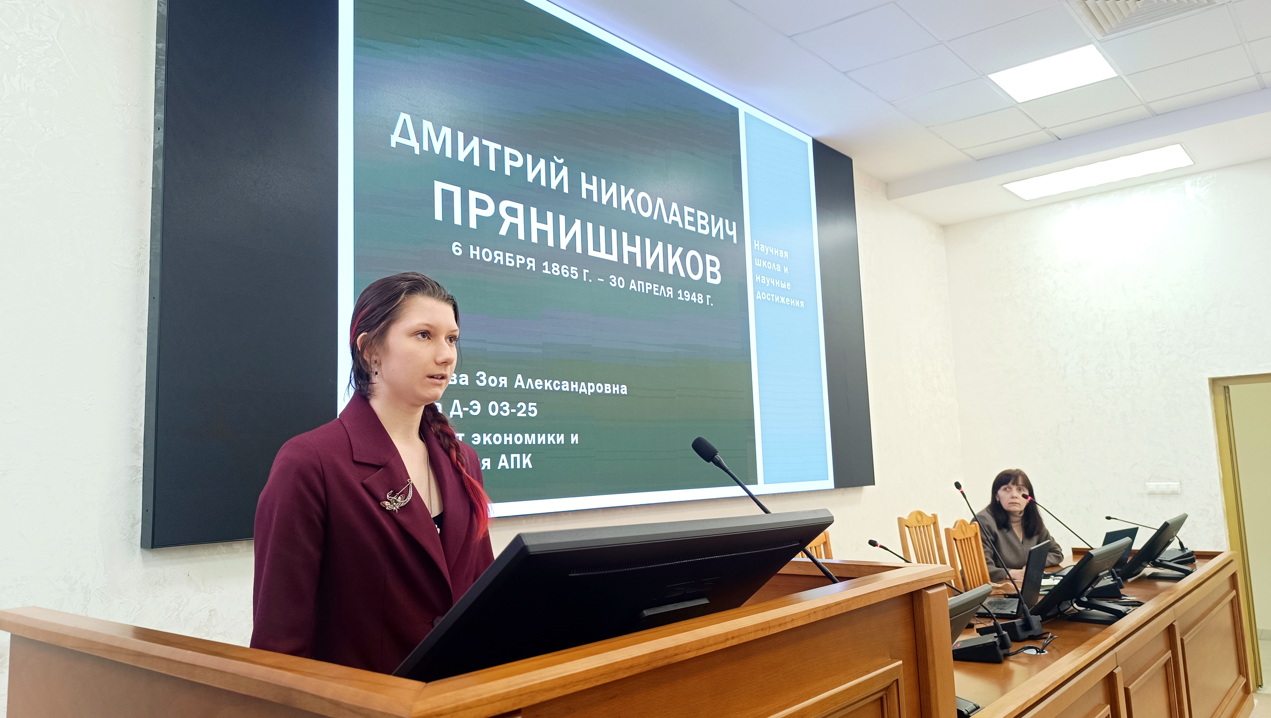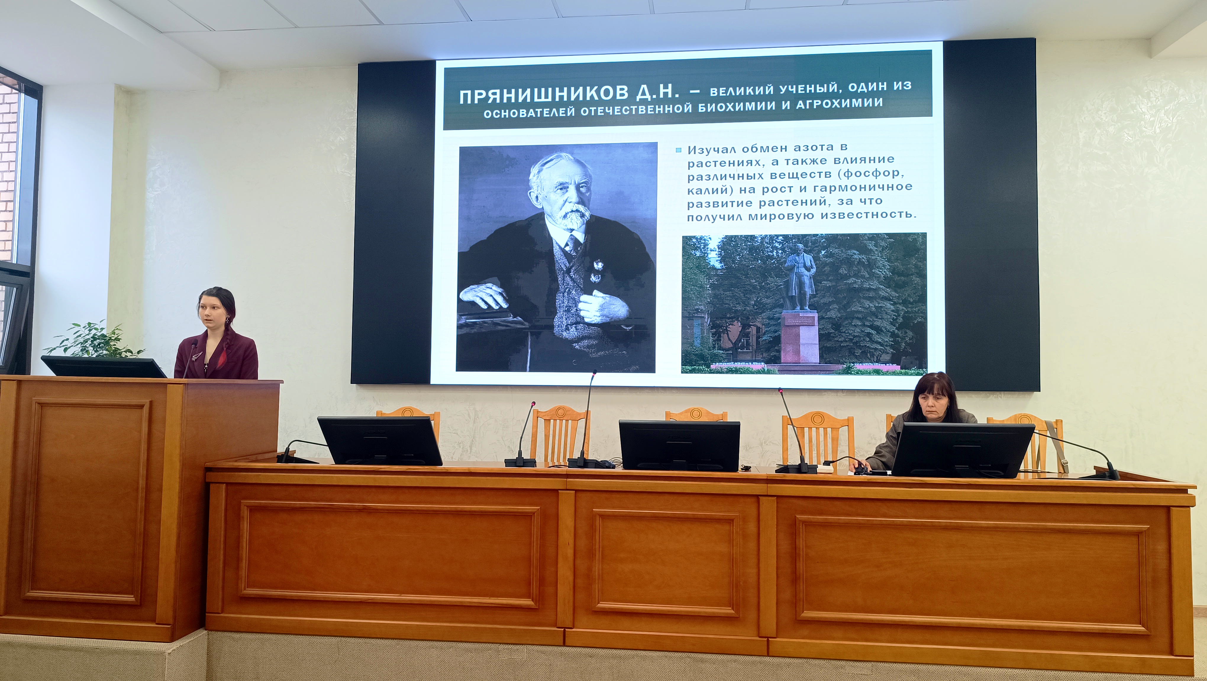 После выступления А.Б. Оришева последовали доклады студентов. Зоя Александровна Веселова рассказала о научной школе и ключевых достижениях Д.Н. Прянишникова – одного из основоположников отечественной агрохимии и биохимии, подчеркнув роль его наставников В.В. Марковникова и К.А. Тимирязева. Она подробно остановилась на фундаментальных исследованиях ученого в области азотного обмена растений, в частности на роли аспарагина, а также на его выводах о высокой эффективности совместного применения фосфорных и аммиачных удобрений. Также докладчица отметила вклад Д.Н. Прянишникова в воспитание нового поколения ученых (включая Н.И. Вавилова) и привела его крылатое выражение: «Избытком удобрений нельзя заменить недостаток знаний».