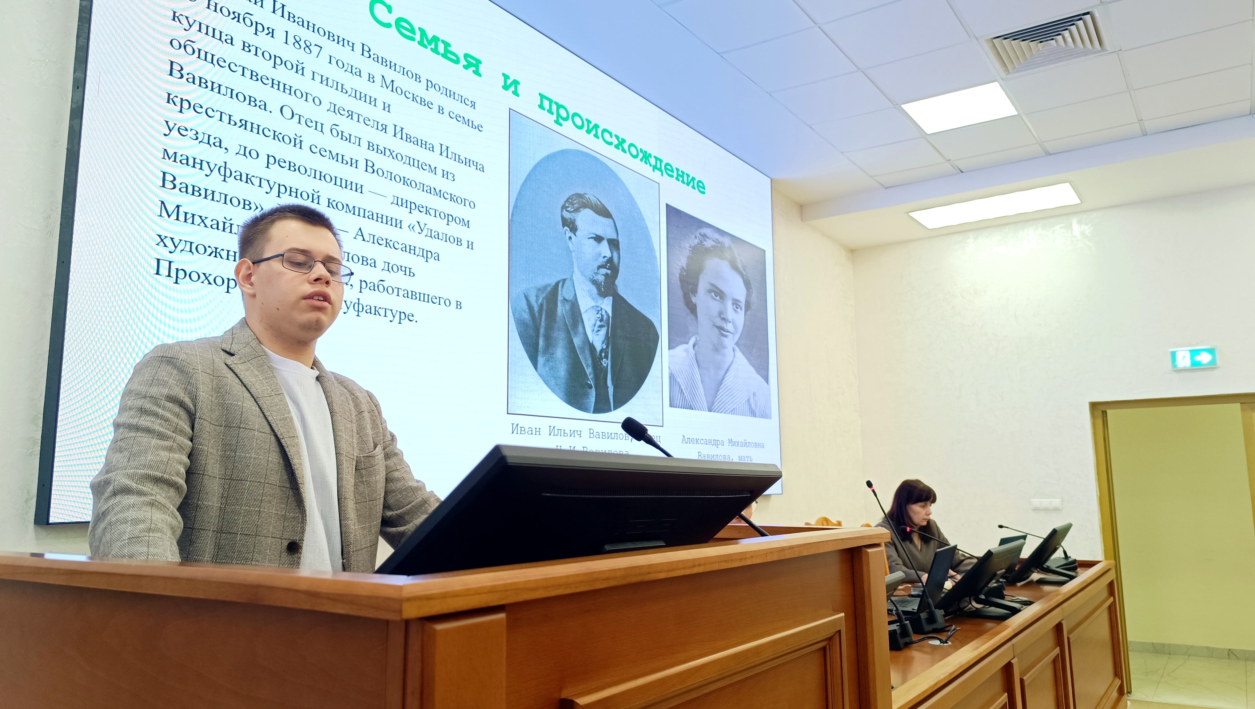 Следующий выступающий, Никита Сергеевич Кочетков, осветил жизненный и научный путь Николая Ивановича Вавилова, отметив его обучение в Московском коммерческом училище и Московском сельскохозяйственном институте (ныне РГАУ-МСХА имени К.А. Тимирязева). Докладчик подробно остановился на ключевых достижениях ученого (в частности, на законе гомологических рядов наследственной изменчивости), а также на его роли в становлении отечественного плодоводства. Отдельное внимание докладчик уделил трагическому периоду жизни Н.И. Вавилова – его конфликту с Т.Д. Лысенко, аресту и гибели в саратовской тюрьме, подчеркнув колоссальное наследие, оставленное ученым, и важность сохранения памяти о нем.
