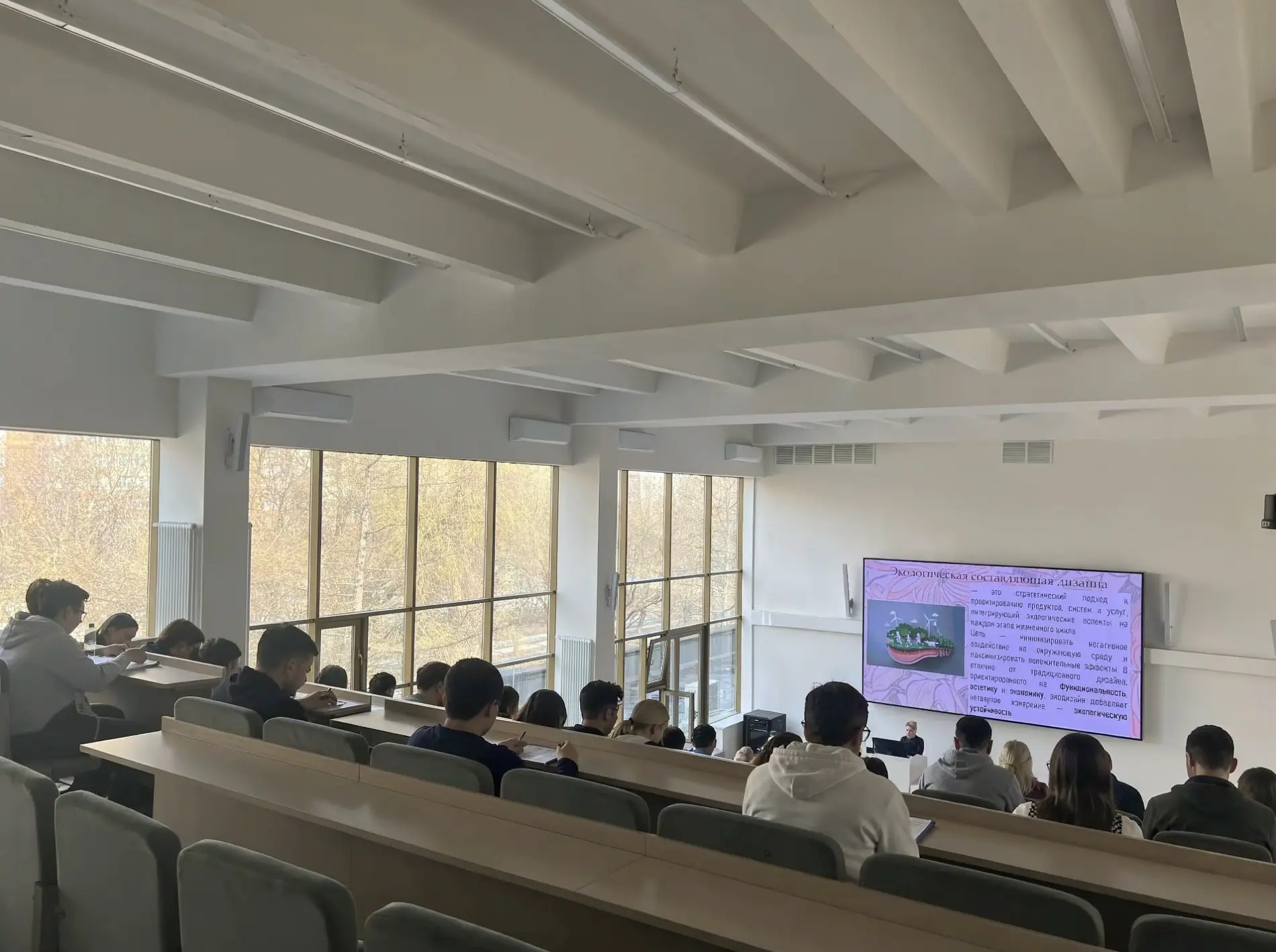 Студентов интересовало по каким критериям следует выбирать материалы и как найти баланс между ценой, эстетикой и экологичностью, а также как принципы экологического дизайна проявляются в архитектуре, интерьере и городской среде (свет, воздух, озеленение, переработка отходов) и, что важнее для устойчивости: новый «зеленый» объект или адаптация существующего.
