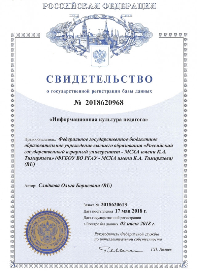 На днях профессор кафедры педагогики и психологии Ольга Сладкова получила свидетельство на базу данных «Информационная культура педагога»