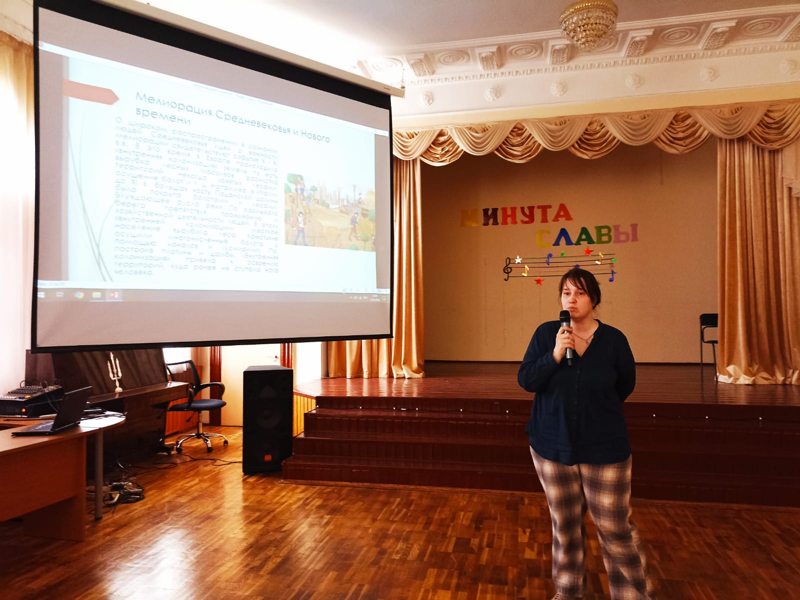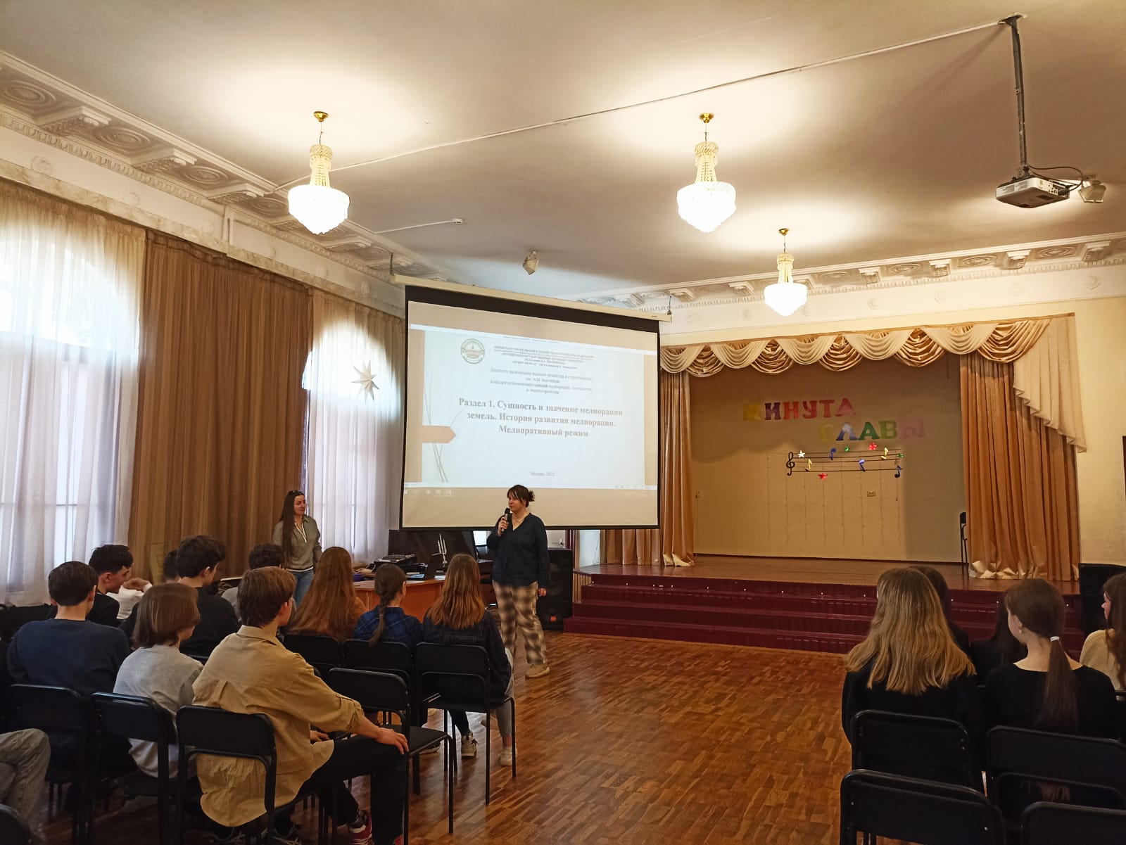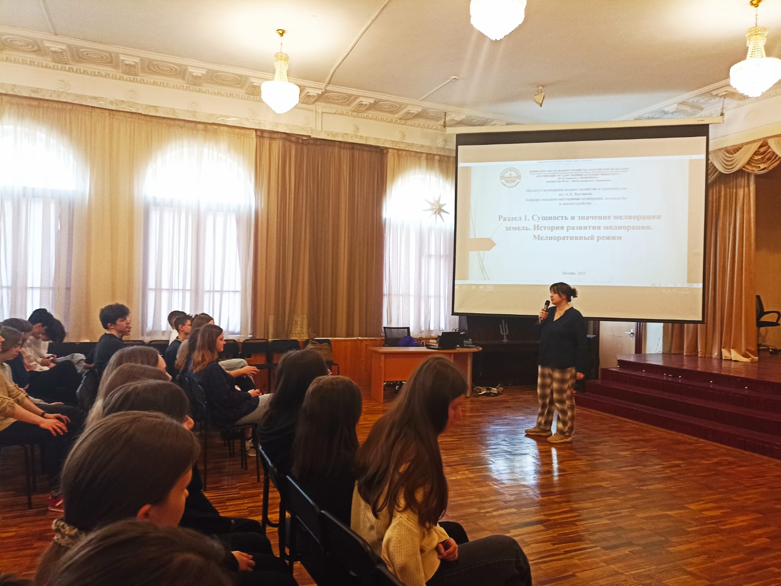 27 Апрель / 2023Оксана Михайловна провела интересную лекцию для учеников, поделилась своим опытом работы в области космических исследований и технологий в мелиорации. Она рассказала о том, как использование самолетов, БПЛА, спутников может помощь в автоматизации орошения и увлажнения почвы, что увеличит урожайность земельных угодий.