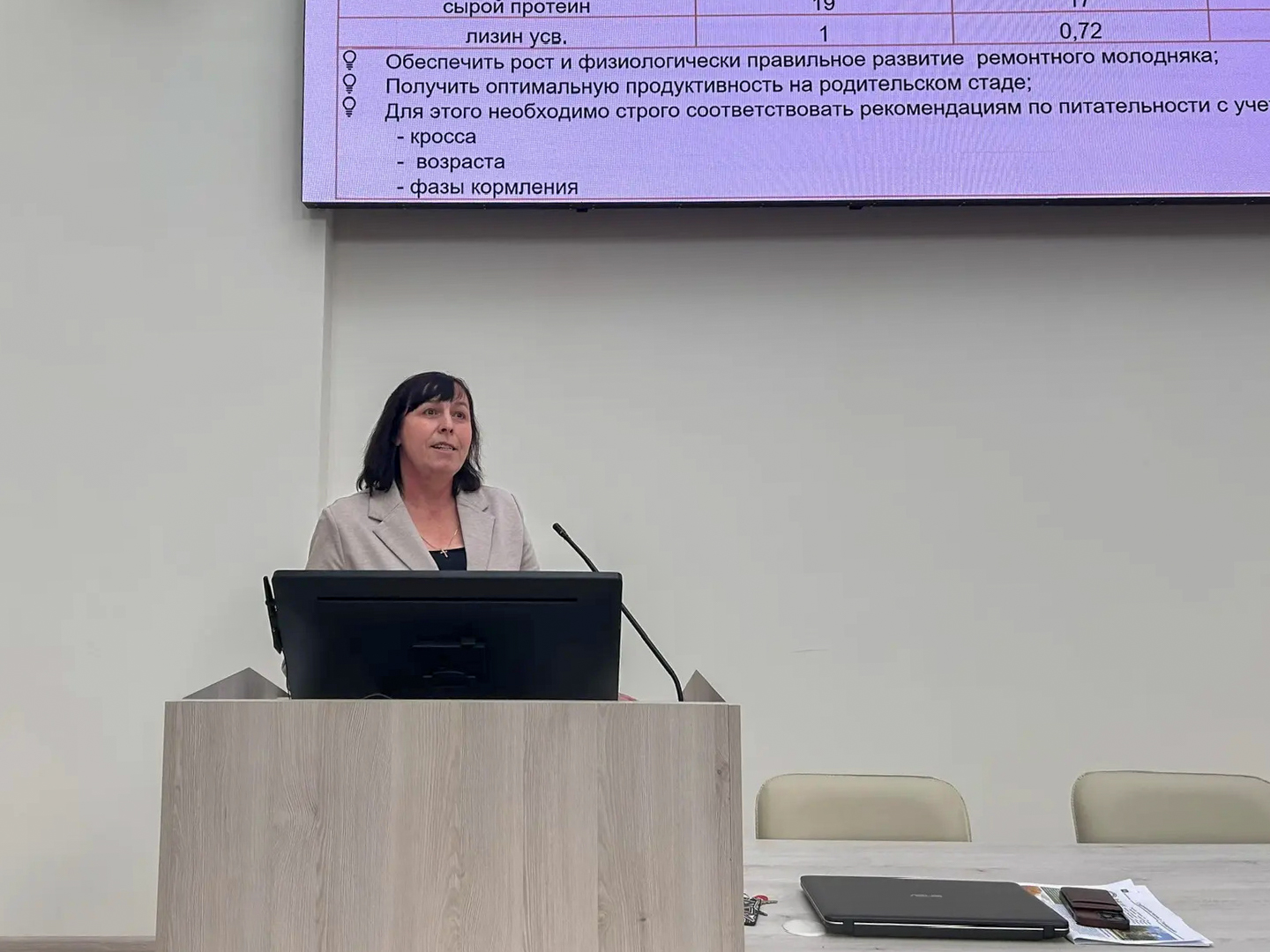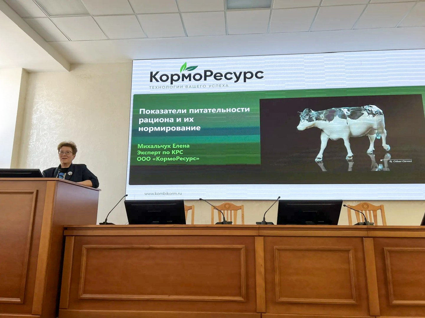 Спикером этой сессии выступила Елена Михальчук, технический специалист по крупному рогатому скоту (КРС). В своём выступлении Елена погрузила слушателей в современные подходы к кормлению КРС. Вместе с аудиторией она подробно разобрала ключевые аспекты оценки кормов, а также прошли по основным балансируемым показателям рациона. Особое внимание было уделено оптимальному нормированию питательных веществ, что является залогом здоровья и высокой продуктивности животных.
