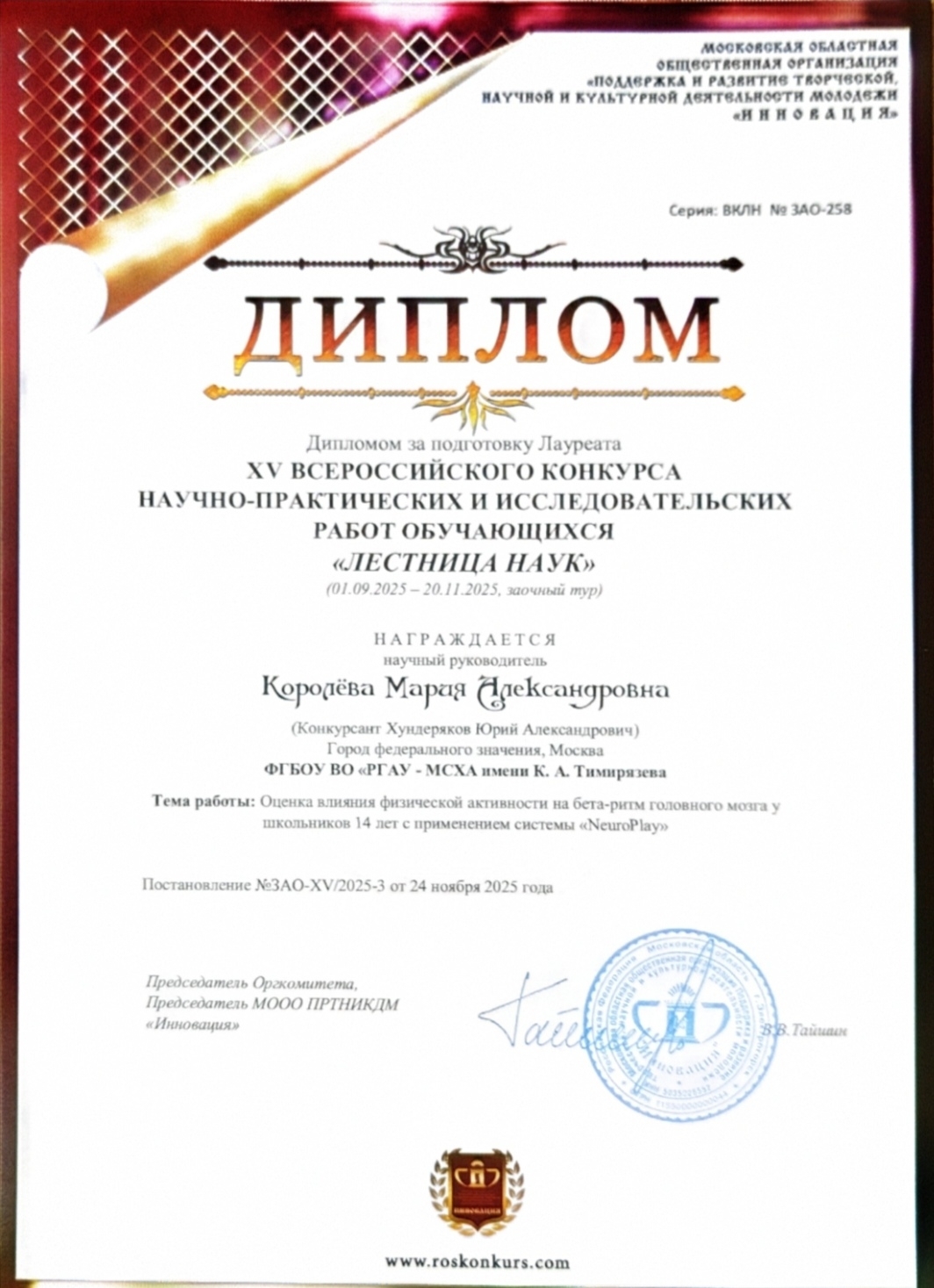Под руководством магистрантки Тимирязевки была подготовлена исследовательская работа на тему «Оценка влияния физической активности на бета-ритм головного мозга у школьников 14 лет с применением системы «NeuroPlay». Данная работа была удостоена звания лауреата конкурса. Оргкомитет конкурса особо отметил вклад наставника, выразив официальную благодарность за творческий подход, активное участие и высокий уровень подготовки воспитанника.
