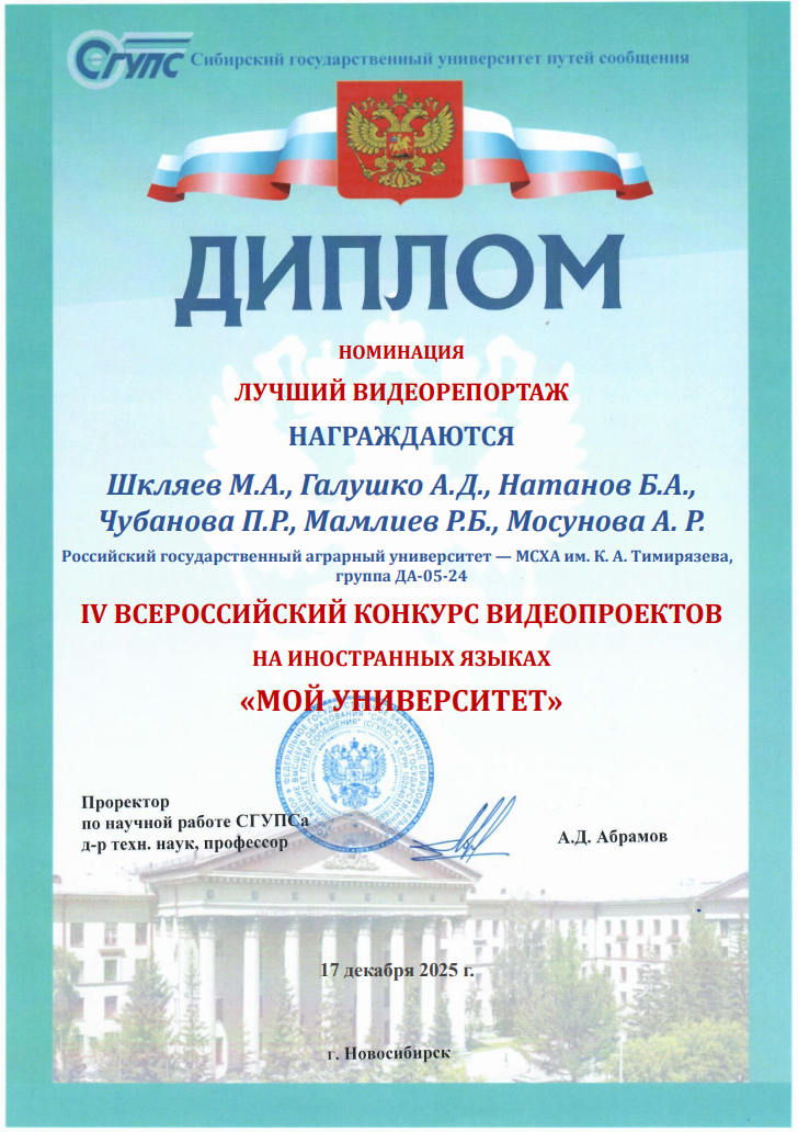 Проект «Agrolife» (авторы: Галушко Александр, Мамлиев Роман, Мосунова Александра, Натанов Богдан, Чубанова Полина, Шкляев Макар и руководитель Бабушкина Лариса Евгеньевна, доцент кафедры иностранных и русского языков) был отмечен специальным дипломом «Лучший видеорепортаж» за оригинальность идеи и креативный подход к презентации студенческого опыта. Жюри высоко оценило актуальность темы, качество съемки и ясность изложения сложного научного материала.