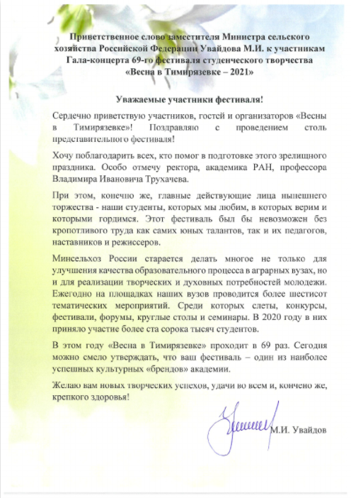 Заместитель министра сельского хозяйства Максим Иосифович Увайдов направил приветственное слово участникам Гала-концерта 69-го фестиваля студенческого творчества «Весна в Тимирязевке».