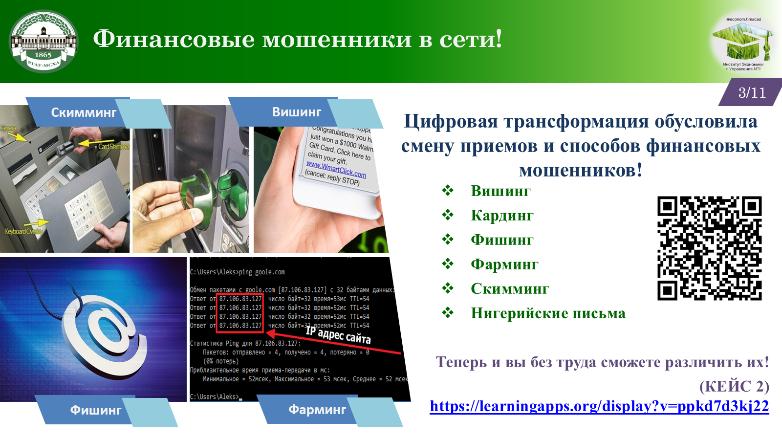 С помощью тематических интерактивных кейсов школьники по обе стороны экрана проверили свои знания с сфере личной финансовой безопасности безопасности, а также познакомились с профессией специалиста по экономической безопасности и узнали об основных видах и способах защиты от финансовых мошенничеств.