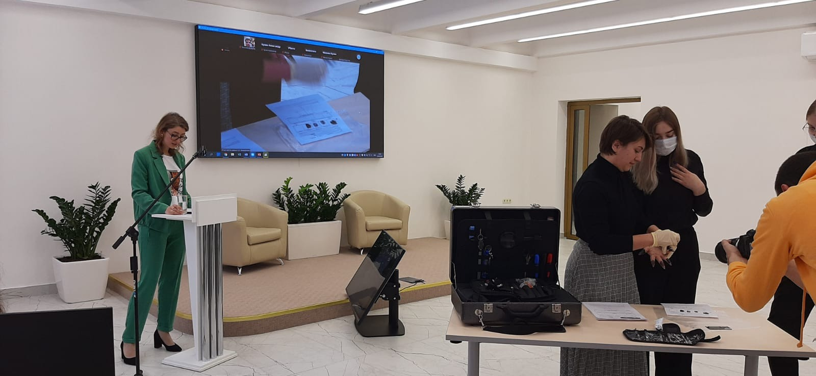 В завершении мастер-класса старший преподаватель кафедры правоведения Сурикова Анастасия Маруановна вместе с гостями провела серию опытов, которые наглядно показали, чем занимается специалист по экономической безопасности. Участники научились снимать отпечатки пальцев, определять подделку документов и изымать улики.