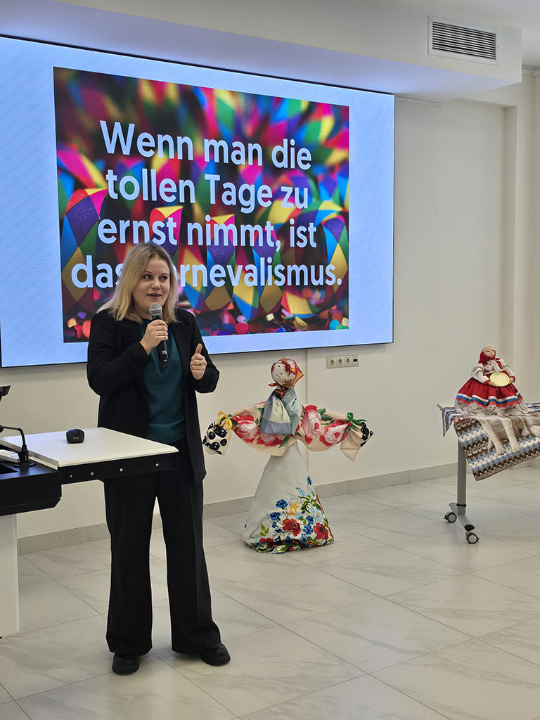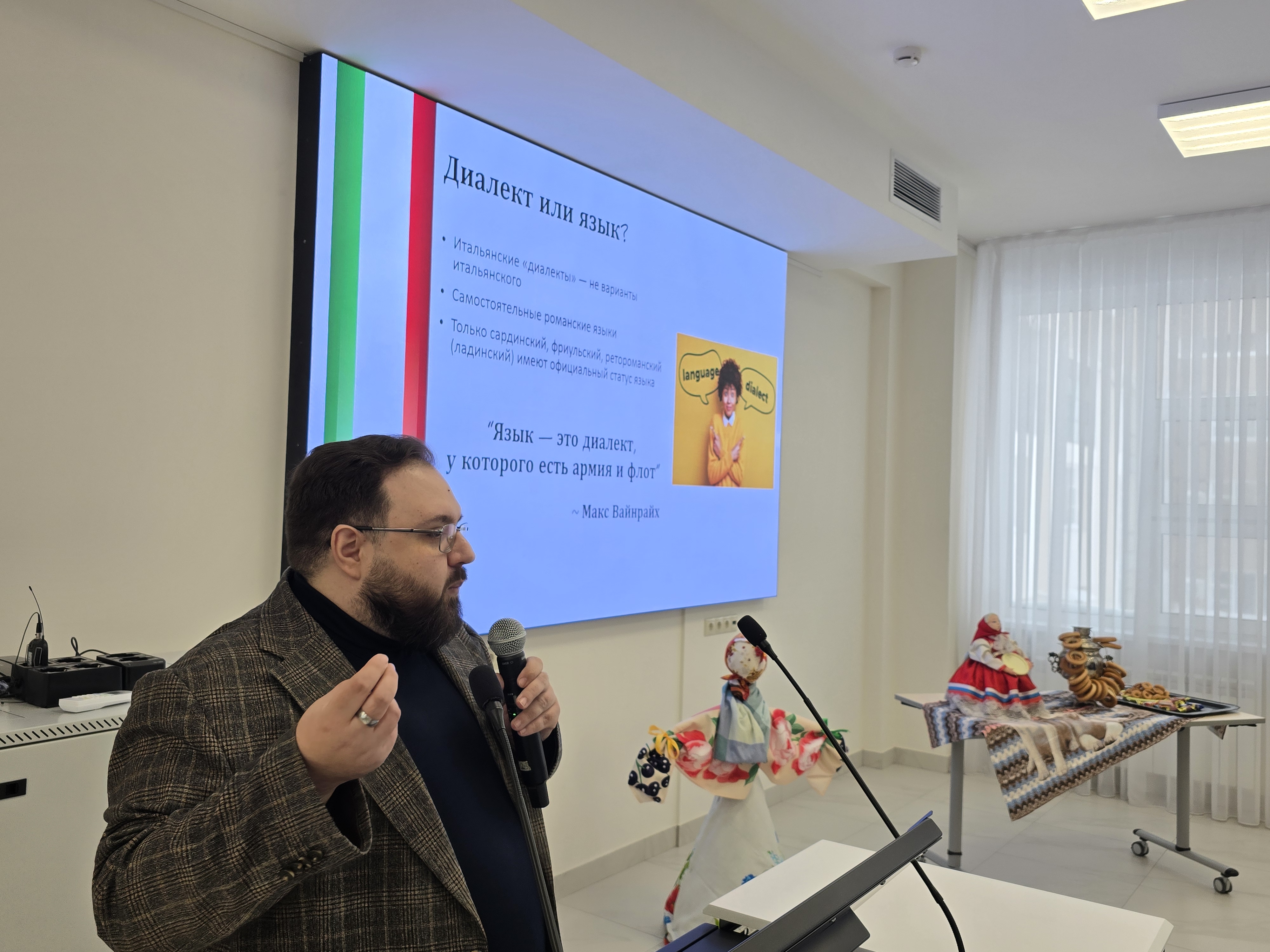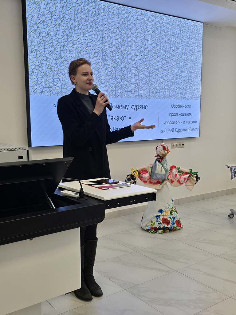 Якопо Винья-Тальянти поведал какие бывают диалекты в Италии и прочитал стихотворение, Е. Н. Ширлина открыла секреты, что можно и чего нельзя делать в Германии, Е.Н. Сидорова в прекрасном национальной костюме рассказала о Родной земле - Мордовии, искусстве и прочитала стихотворение на эрзянском языке, Н.А. Сергеева вместе со студентами ДМ 18-25 показала презентацию, где пословицы были представлены на "языке студентов" с переводом, В.Г. Рябчикова со студентами Косульниковой Екатериной, Трубиной Алисой, Трусовым Федором, ДЭ 15-25, сделали красочное оформление зала и смастерили фигуру Масленицы, И.А. Синицына рассказала о русском языке в космосе. Особо запомнились выступления студенток ДЭ 313 Шакировой Гульназ "Родной язык. Муса Джалиль и сердце Татарстана" и Виткаловой Инны «Живая старина: Почему куряне "гэкают" и "якают"» об особенностях произношения, морфологии и лексики жителей Курской области - руководитель А.А. Зайцев и Отякина Алексея, ДЭ 24-25, «Особенности норвежского языка» - рук. Кирсанова М.М.