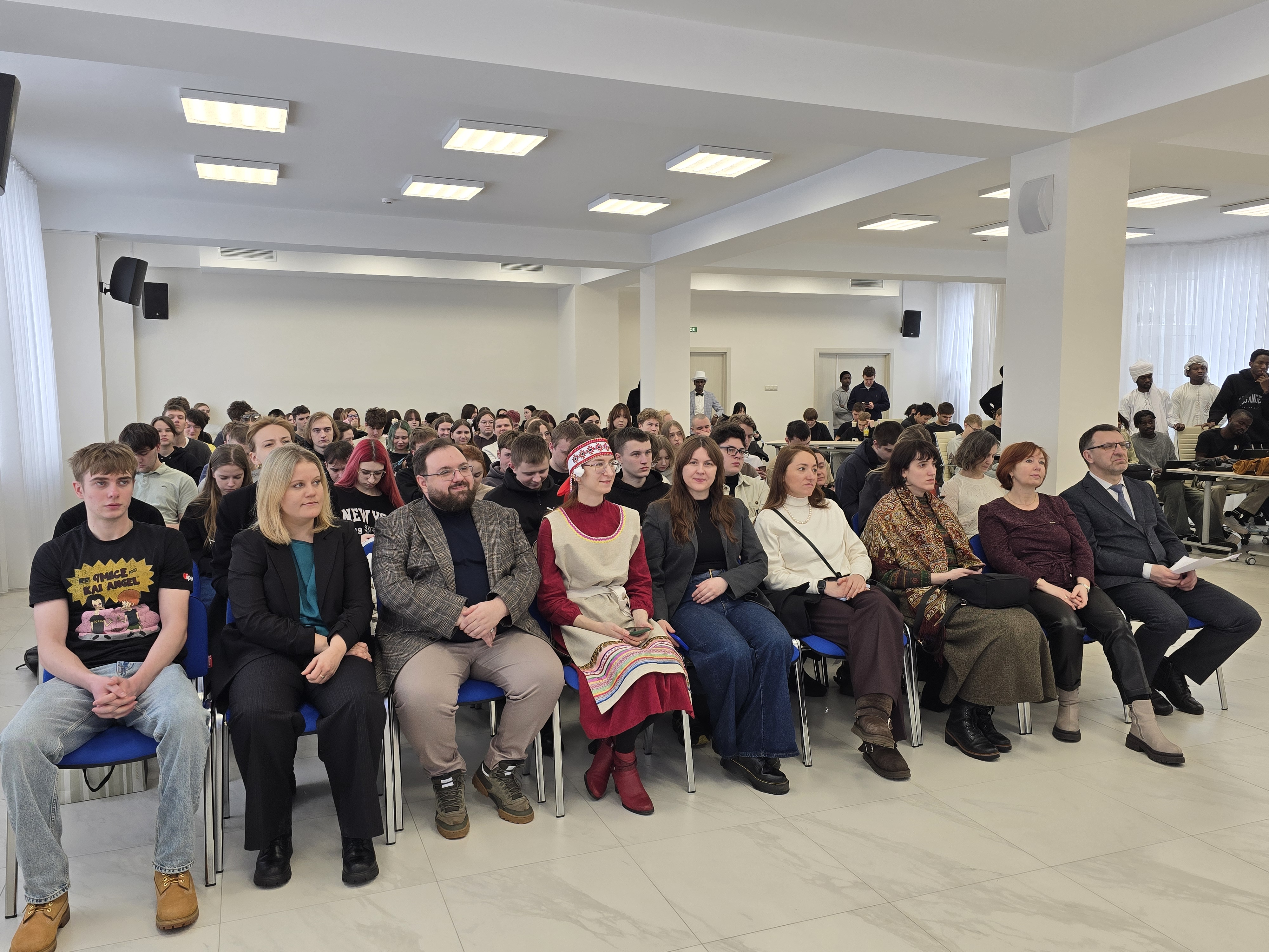 Студенты-иностранцы под руководством А.А. Зайцева и А.И. Милостивой удивили необычными выступлениями. Китайские студенты Ченг Гехан и Фан Юйцзе, ДЭ 04-25, поздравили всех собравшихся с Китайским Новым Годом и подарили стихотворение на русском и китайском языках. Студенты африканских стран Джамал Шериф Иссаха и Абделнассир Юссуф Закария, ДА 08-25, и Сума Абубакар ДЗ 23-24, Ндиай Бабакар ДЗ-24, Фаами Фульберт, ДЗ27-24, в национальных костюмах, поделились интересными фактами о традициях стран Западной Африки и Республики Чад, студентка Аграфиоти Фани, ДЗ 12-25, из Греции рассказала об истории греческого языка. Особое внимание привлекло выступление студентки Ракутундрадзау Маминириана Намбинина, ДТ 01-25, из Мадагаскара, познакомившей с этой удивительной страной, известной своей уникальной культурой и природным разнообразием.