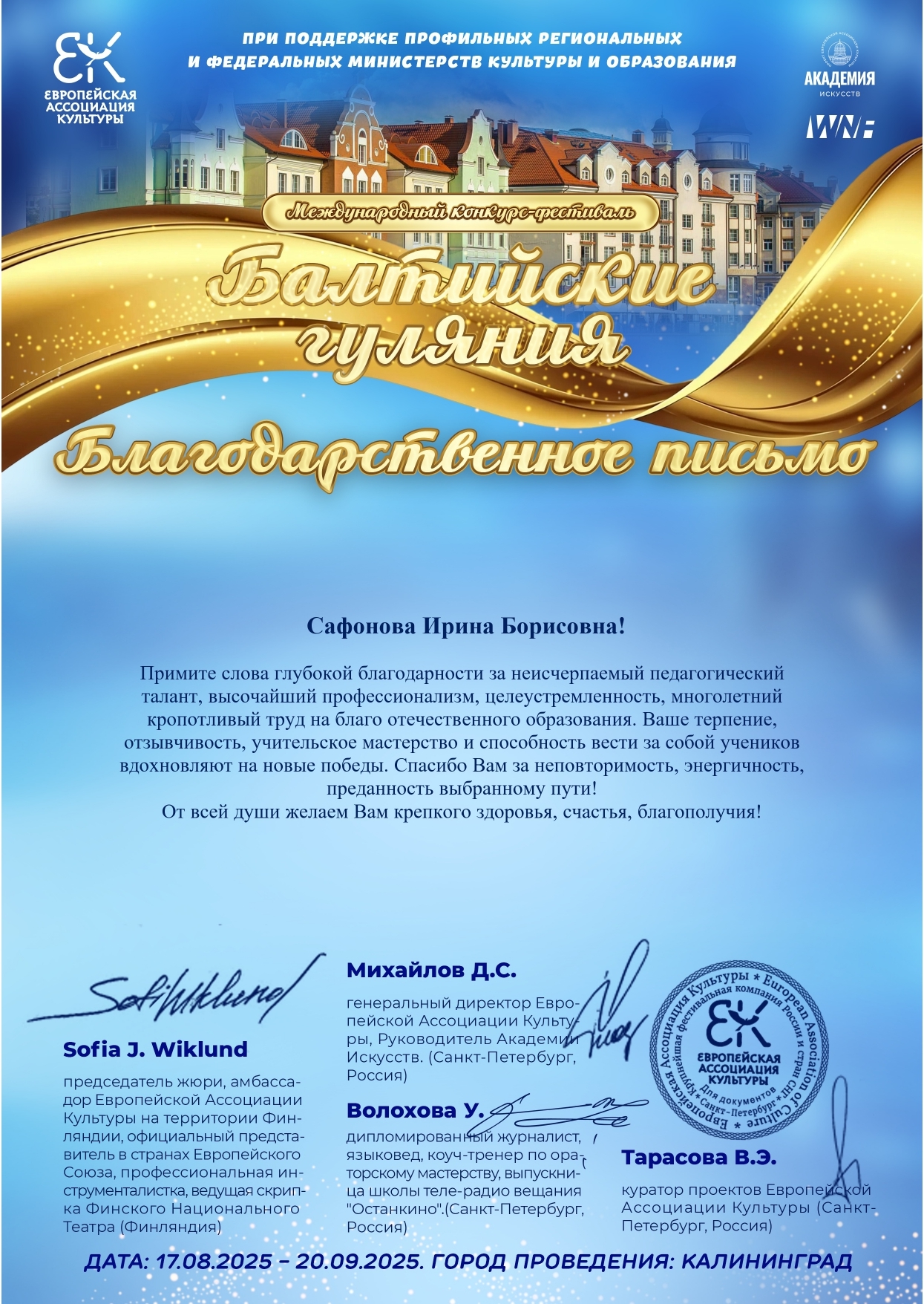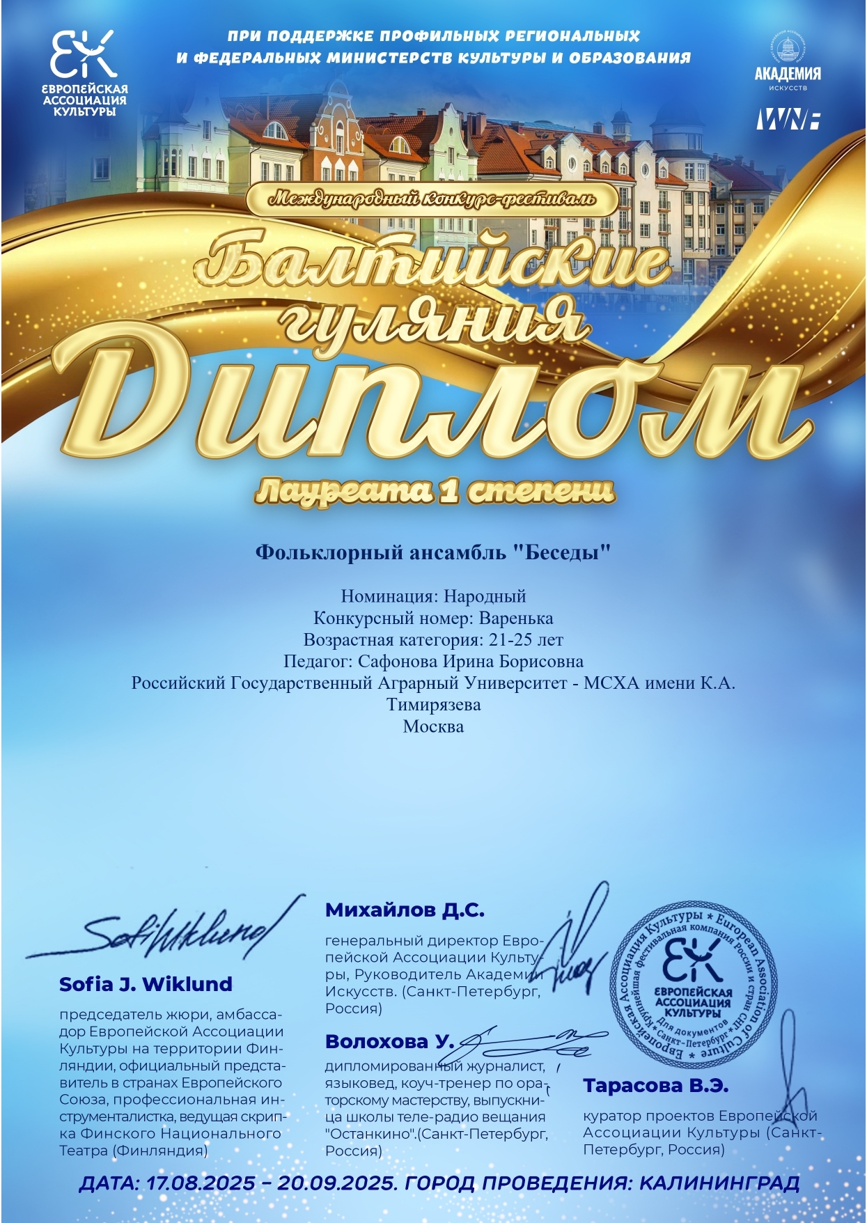 Талантливый коллектив Российского государственного аграрного университета – МСХА имени К.А. Тимирязева ансамбль «Беседы» одержал блистательную победу в Международном конкурс-фестивале «Балтийские гуляния».