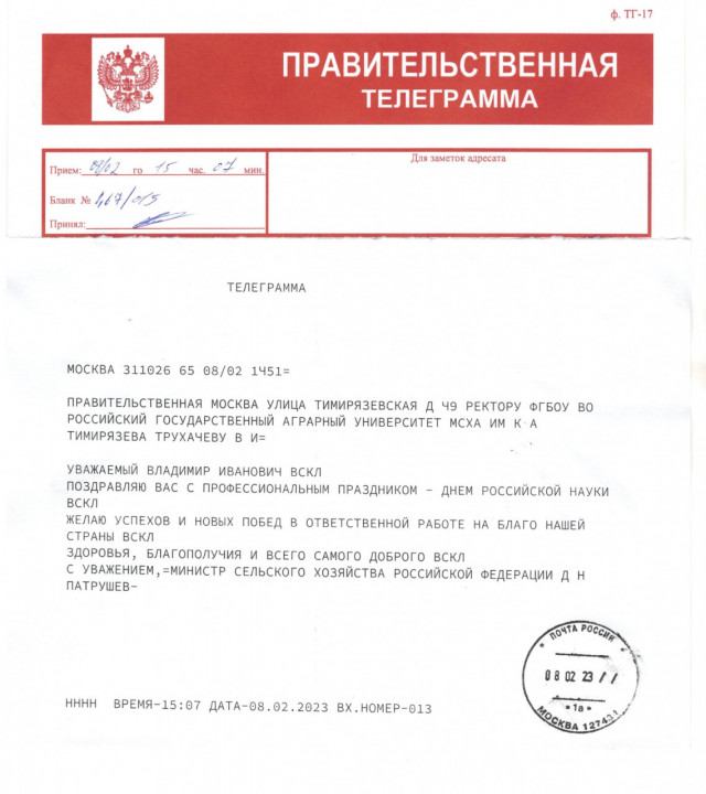 Министр сельского хозяйства Российской Федерации Дмитрий Николаевич Патрушев направил поздравление ректору, Академику РАН, профессору Владимиру Ивановичу Трухачеву, а в его лице всему многотысячному коллективу преподавателей, сотрудников и студентов Тимирязевской академии с Днем российской науки.