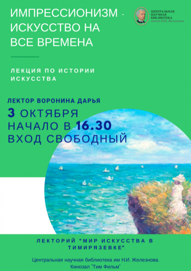 Первая лекция осеннего цикла «Импрессионизм – искусство на все времена» состоится 3 октября в 16:30 в кинозале «ТимФильм» ЦНБ имени Н.И. Железнова. После лекции Дарья Воронина ответит на все вопросы ценителей искусства.