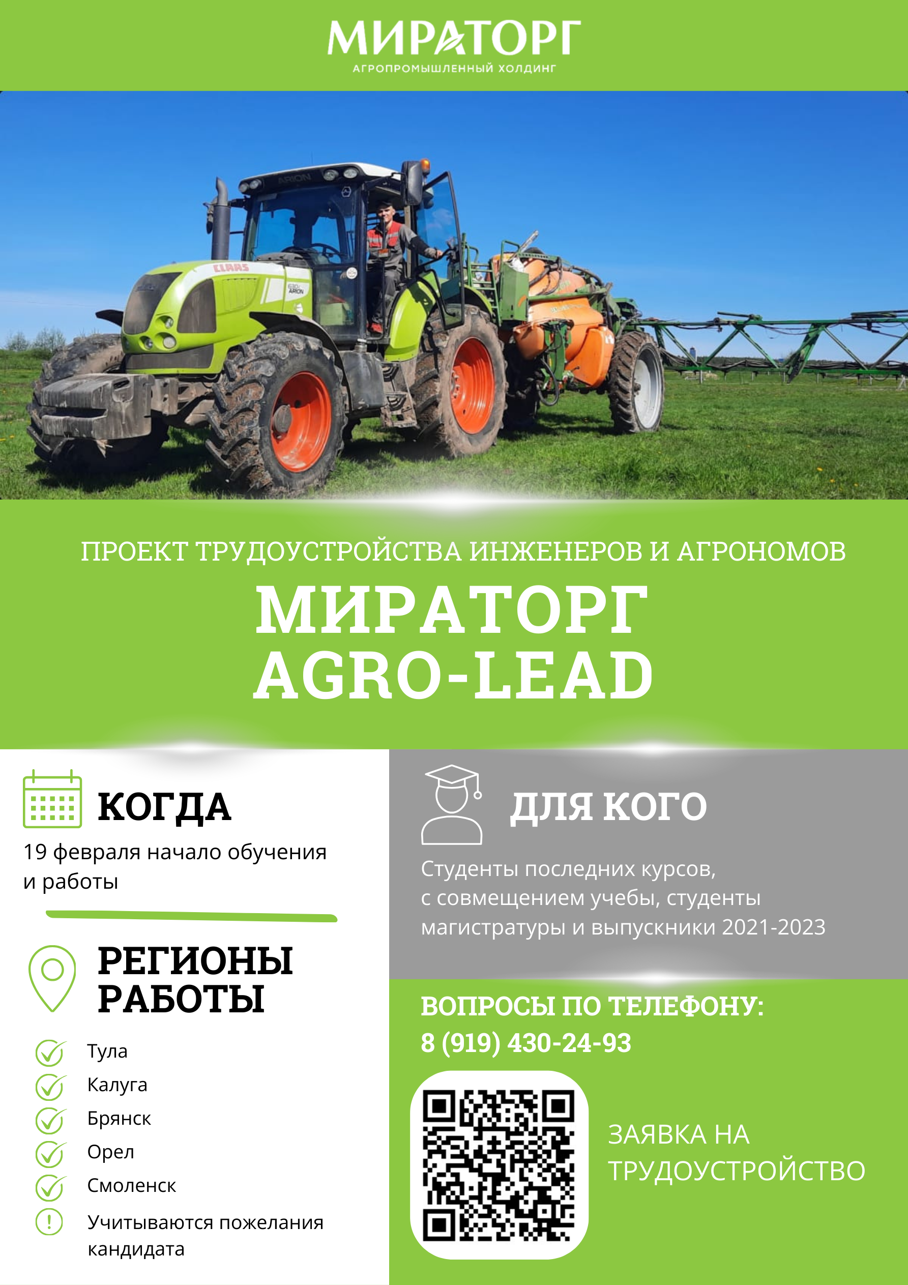 АПХ "Мираторг" запускает проект подготовки управленцев агрономических и инженерных направлений "AGRO-LEAD". Отобранные студенты выпускных курсов бакалавриата и магистратуры пройдут специализированную программу подготовки к самостоятельной работе по управлению земельными ресурсами, техникой и персоналом. По окончании обучения работодатель обещает молодым специалистам гарантированное трудоустройство.