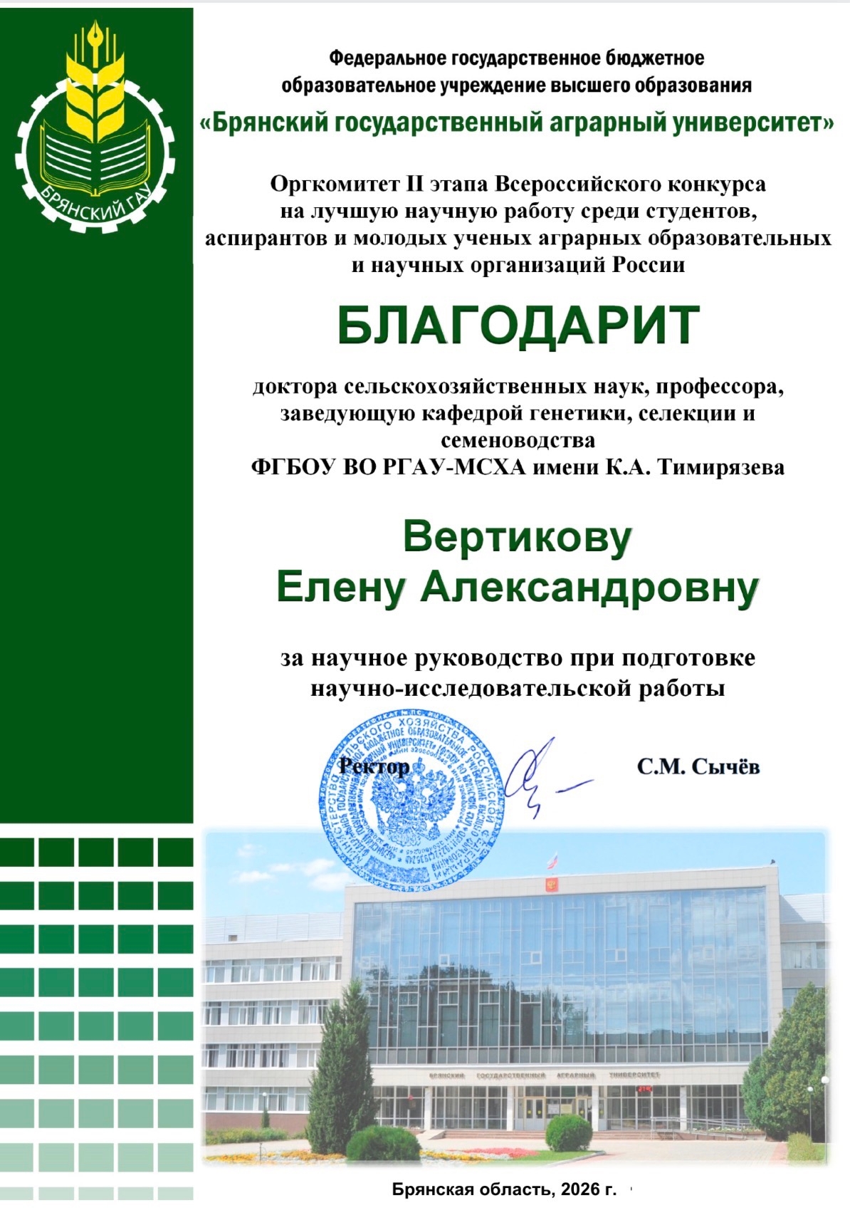 Высокое достижение Анастасии Симагиной стало возможным благодаря её целеустремлённости, глубоким знаниям и кропотливой работе. Несомненно, значительный вклад в её успех внесла и научный руководитель – заведующая кафедрой, доктор сельскохозяйственных наук, профессор Елена Вертикова. За подготовку победителя оргкомитет конкурса выразил преподавателю отдельную благодарность.