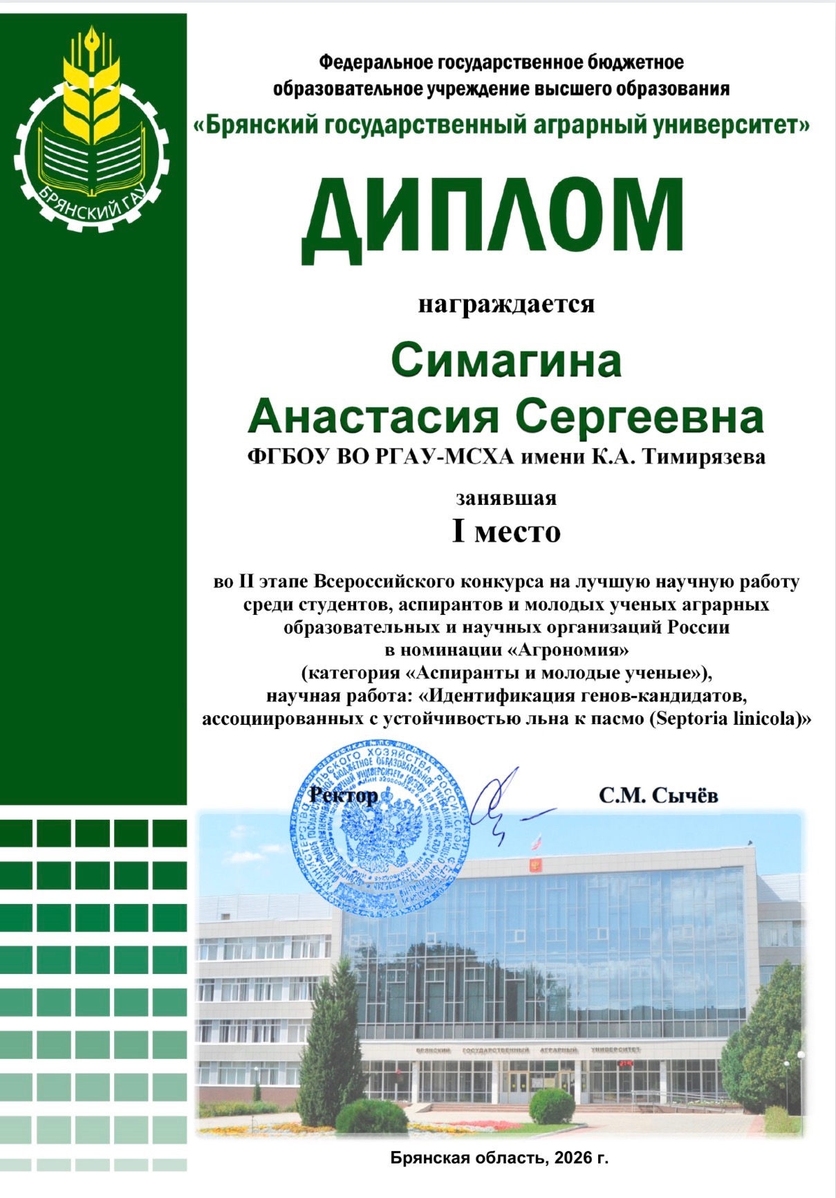 Аспирантка 2-го года обучения кафедры генетики, селекции и семеноводства Российского государственного аграрного университета – МСХА имени К.А. Тимирязева Анастасия Симагина заняла первое место на II этапе Всероссийского конкурса научных работ среди студентов, аспирантов и молодых учёных аграрных образовательных и научных организаций России.