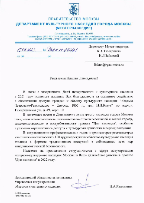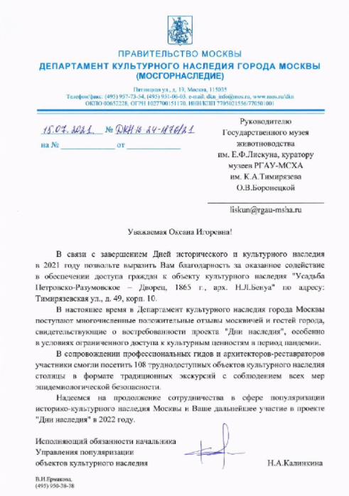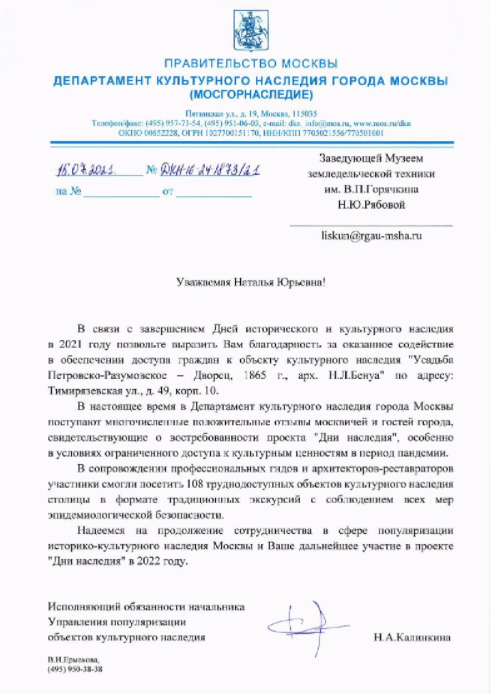 По результатам проведения Дней исторического и культурного наследия сотрудники музеев РГАУ-МСХА имени К.А. Тимирязева были награждены почетными грамотами Департамента культурного наследия города Москвы.