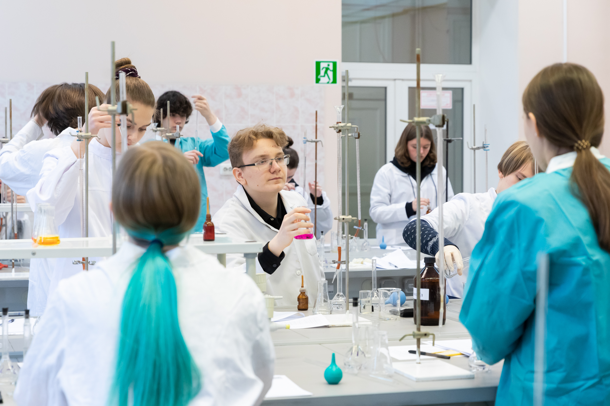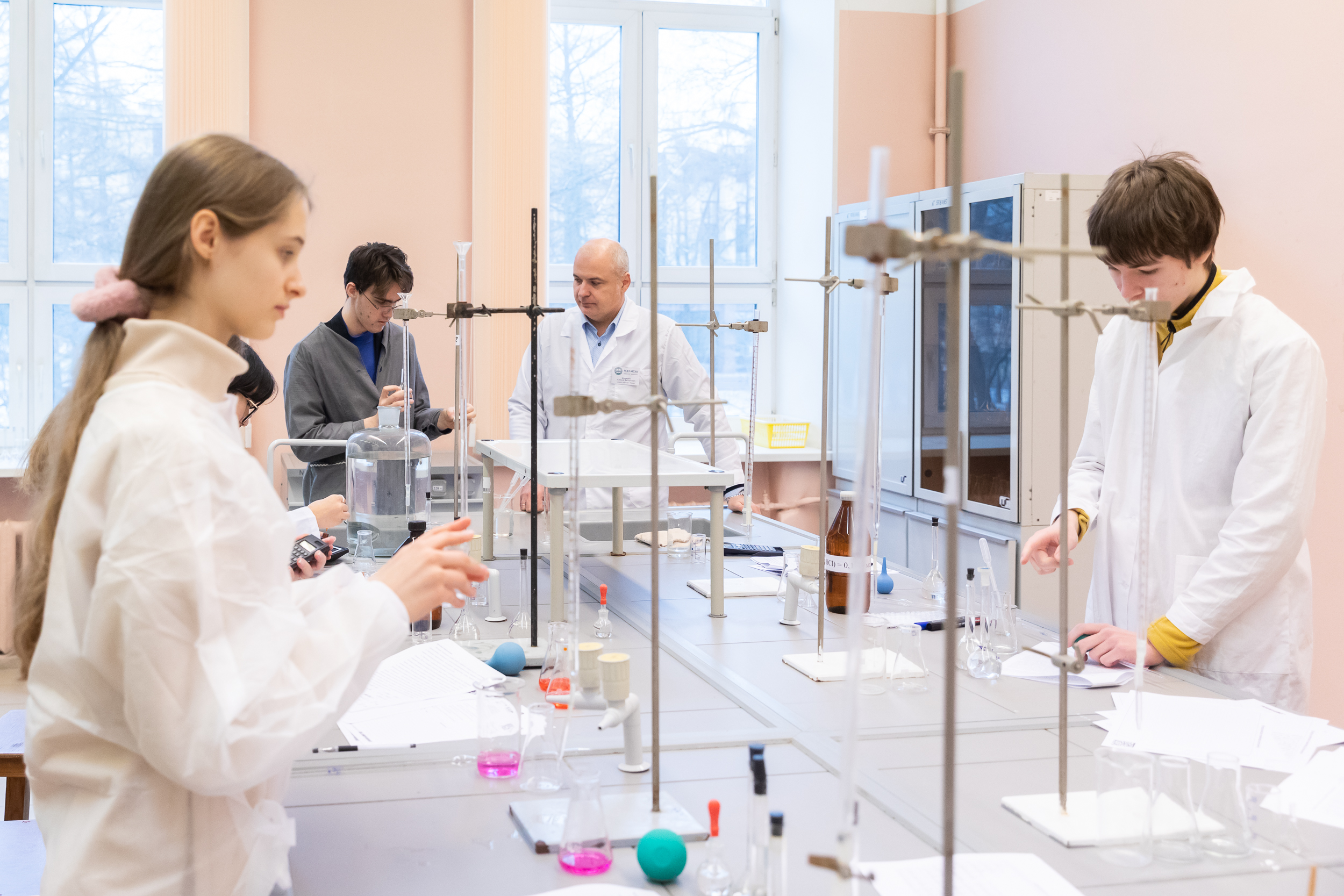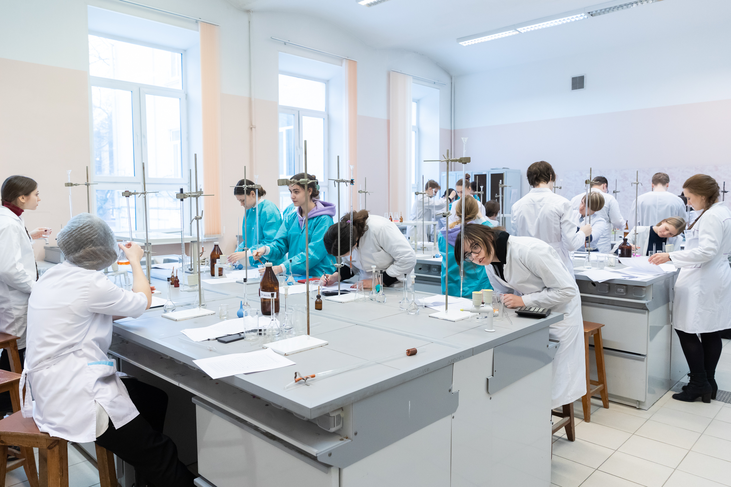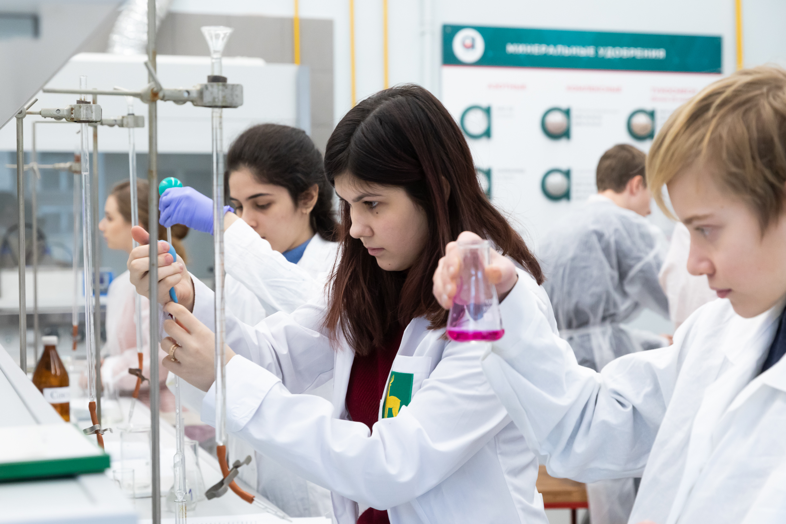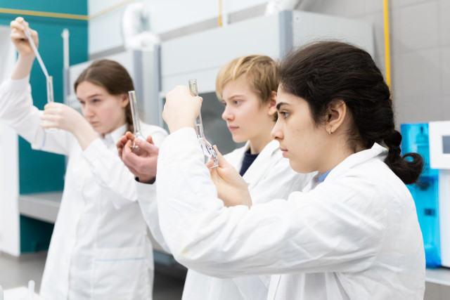 На следующий день для участников был организован химический практикум. Для многих школьников это был первый опыт практической работы в лаборатории, однако под чутким руководством преподавателей кафедры химии они быстро освоились в новом для них аналитическом методе количественного анализа.