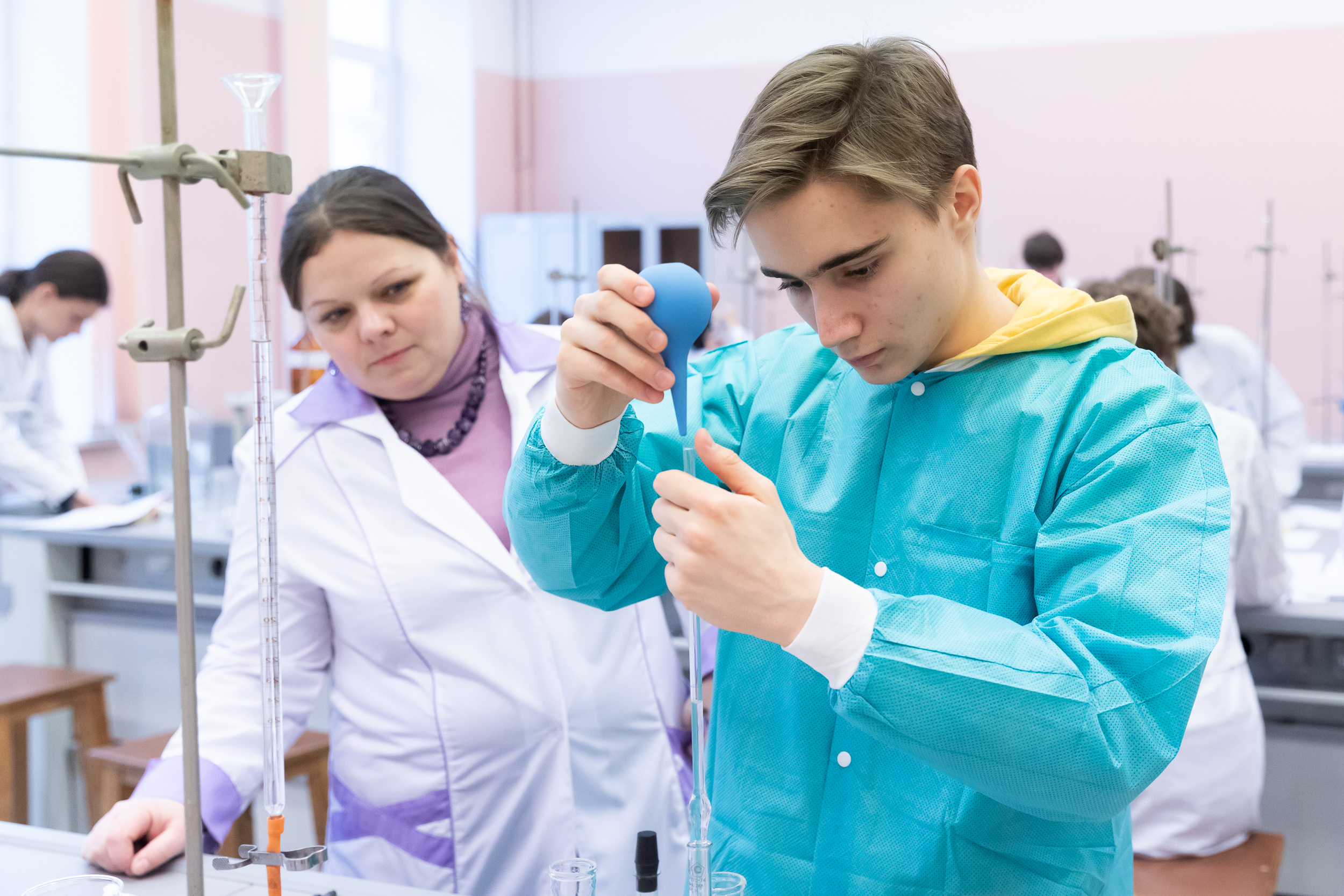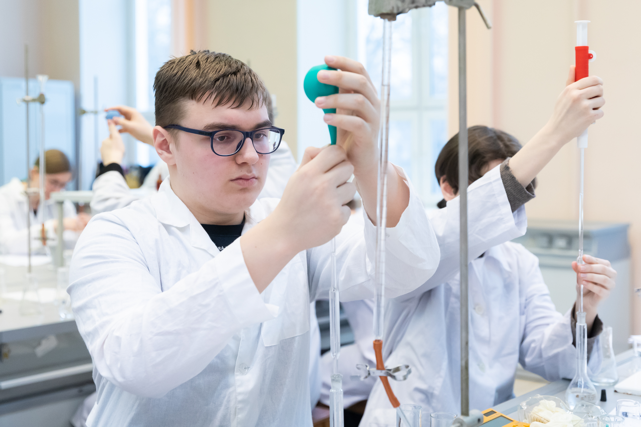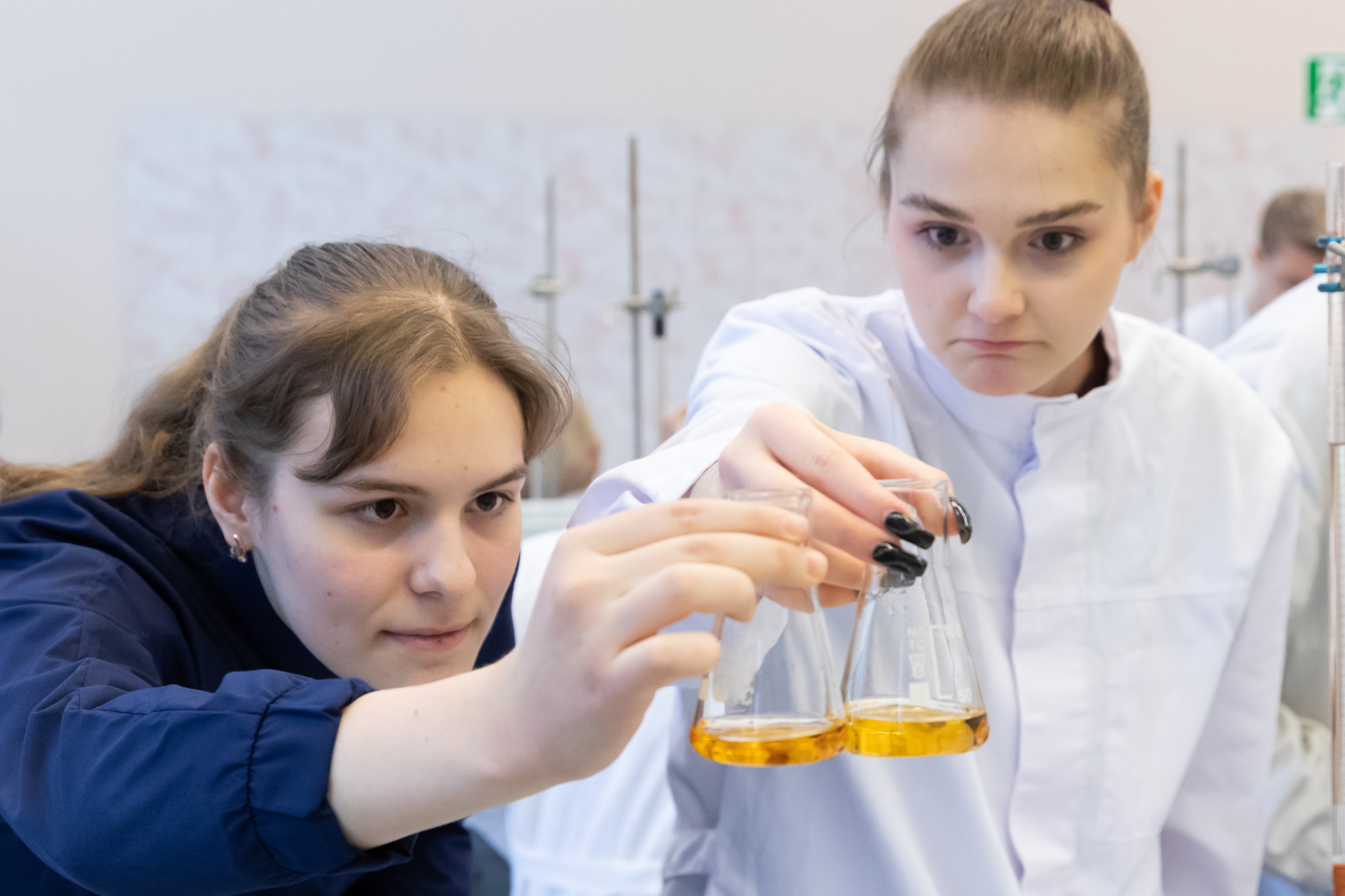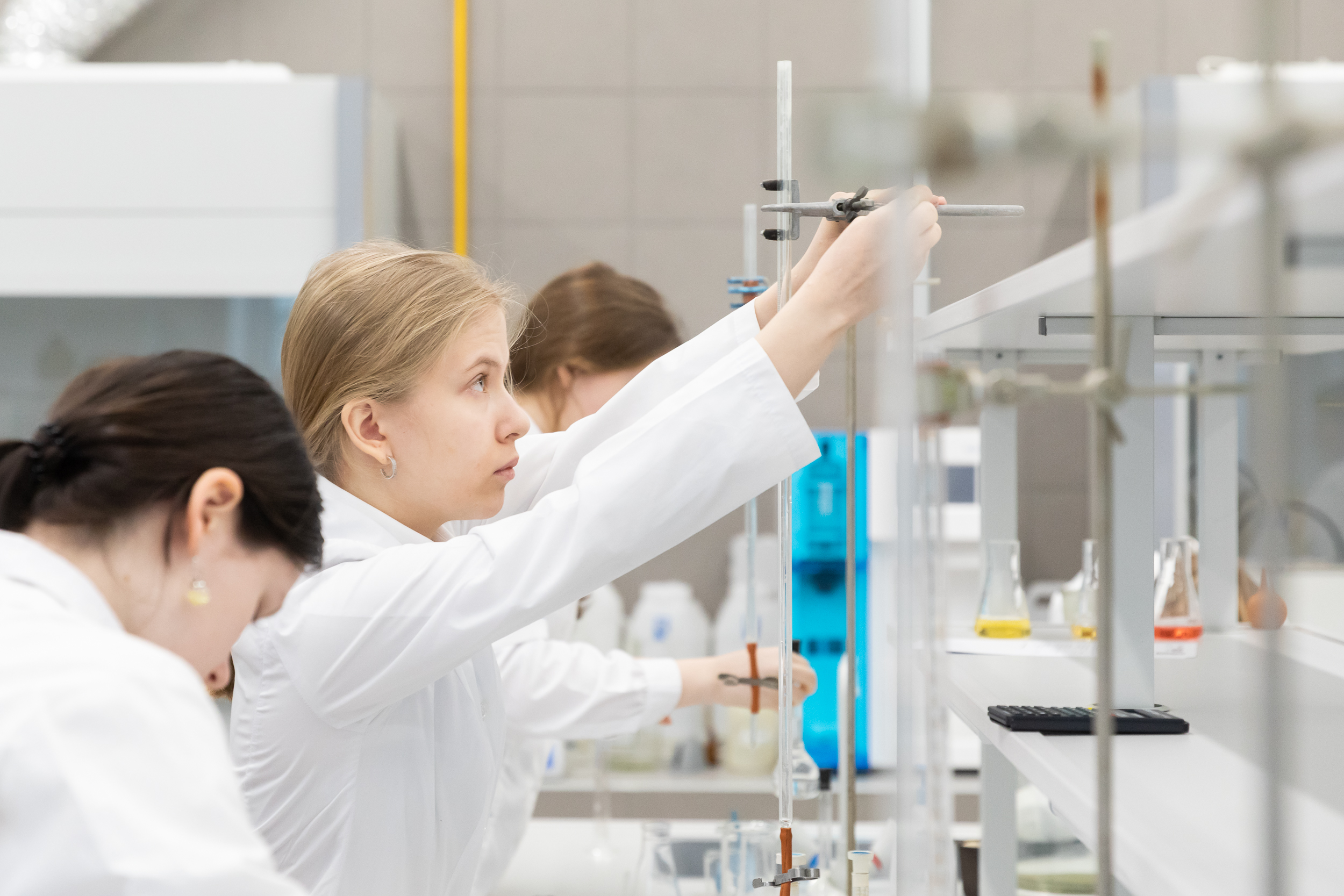На следующий день для участников был организован химический практикум. Для многих школьников это был первый опыт практической работы в лаборатории, однако под чутким руководством преподавателей кафедры химии они быстро освоились в новом для них аналитическом методе количественного анализа.