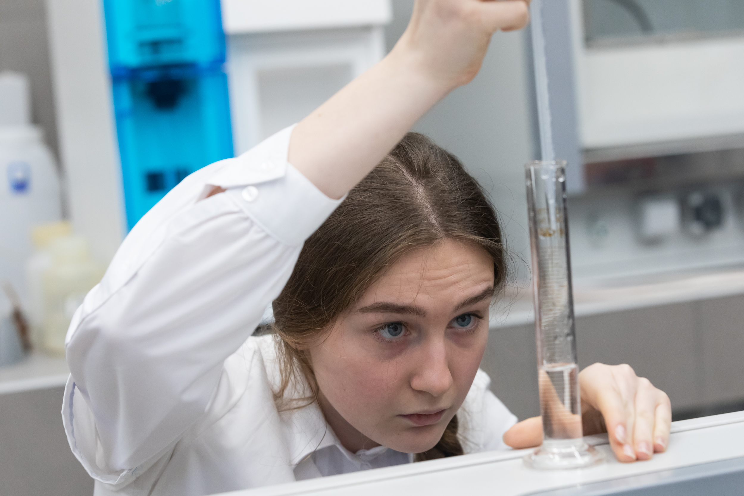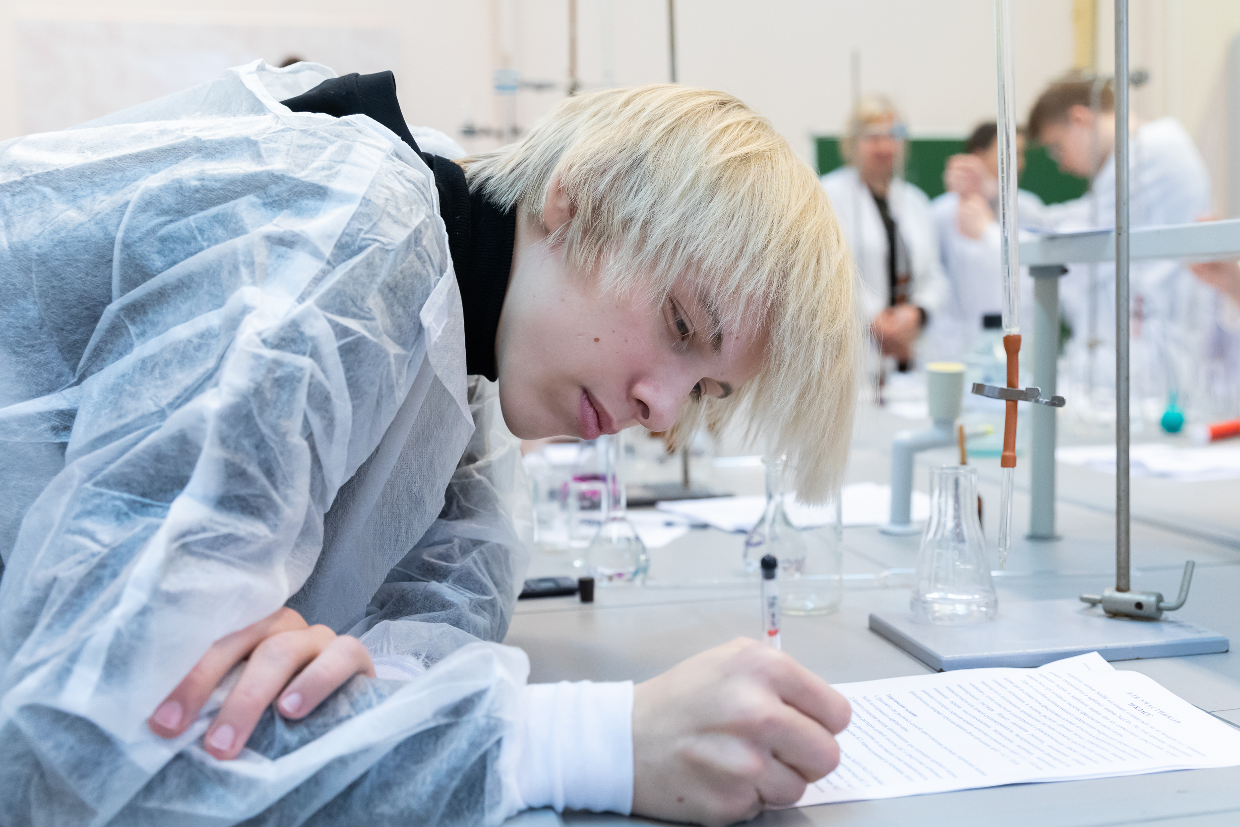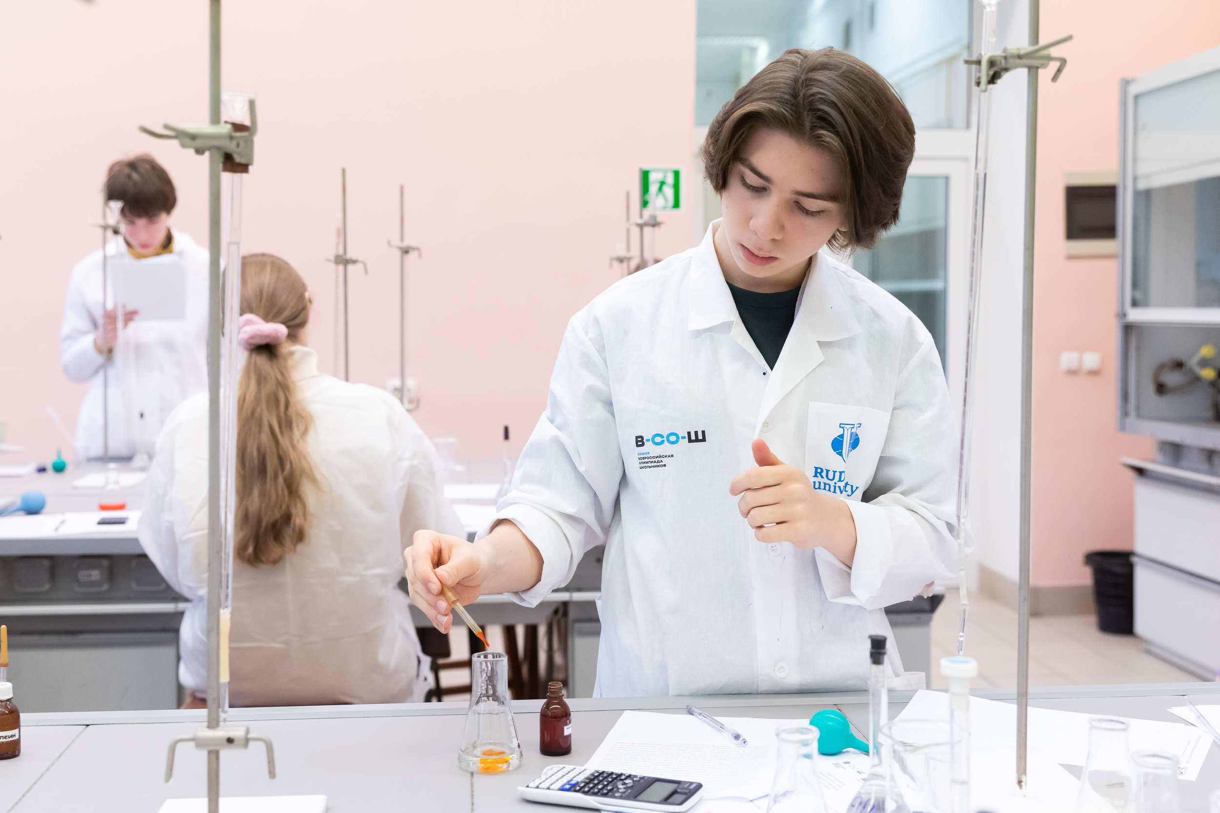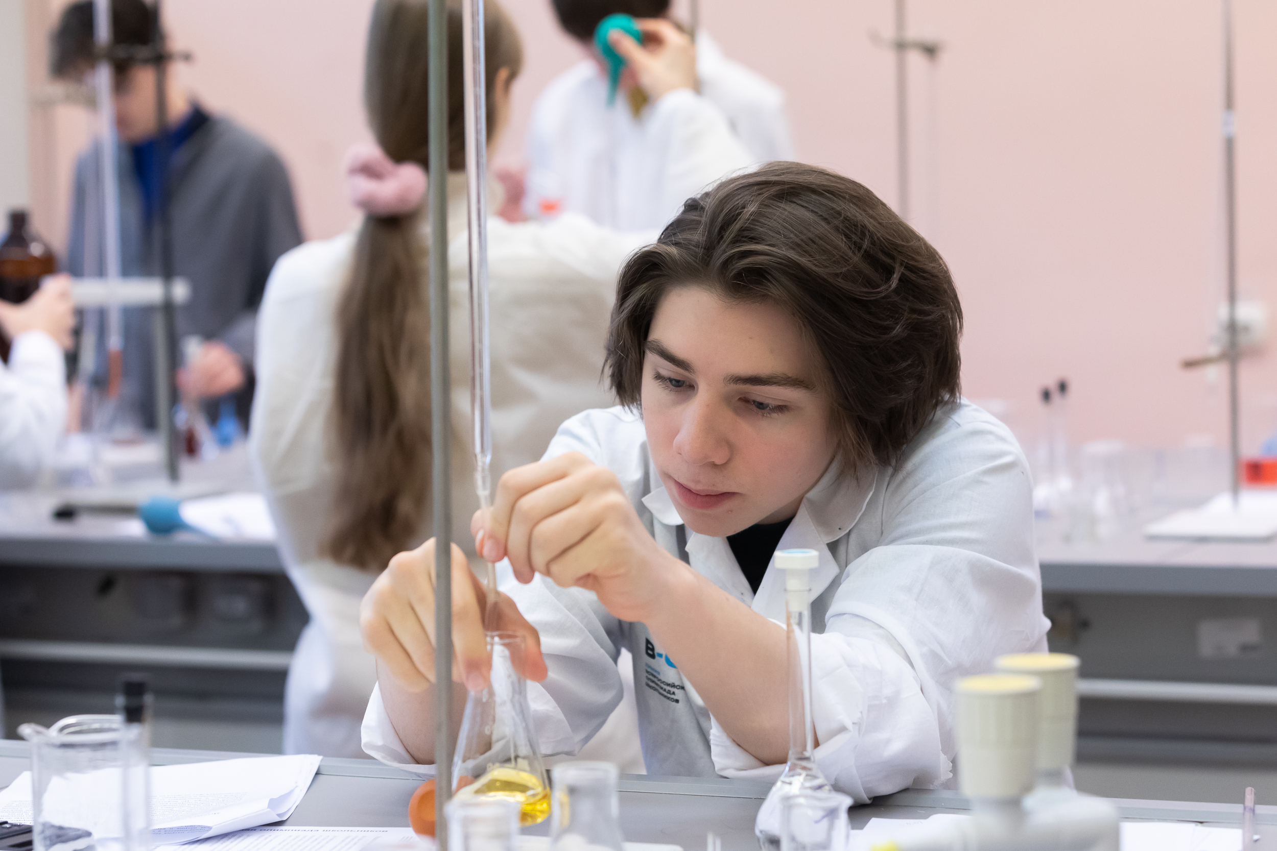 На следующий день для участников был организован химический практикум. Для многих школьников это был первый опыт практической работы в лаборатории, однако под чутким руководством преподавателей кафедры химии они быстро освоились в новом для них аналитическом методе количественного анализа.