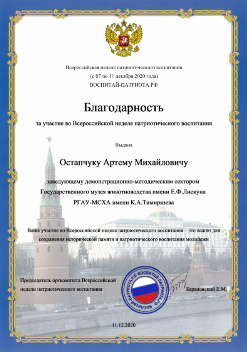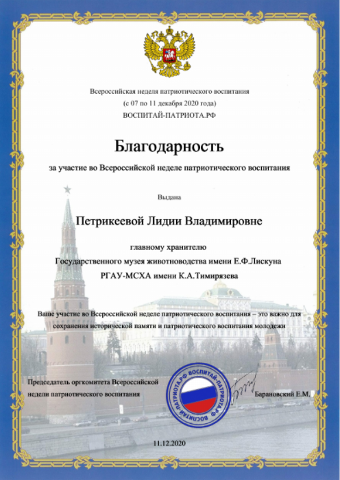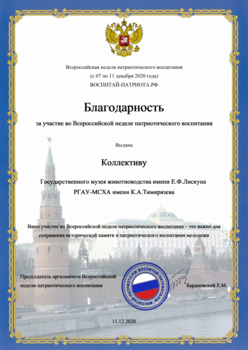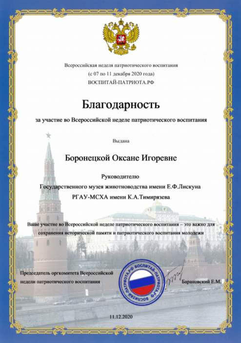 - Университет был достойно представлен в рамках Всероссийской недели патриотического воспитания, - отметила руководитель Государственного музея животноводства имени Е.Ф. Лискуна, кандидат сельскохозяйственных наук Оксана Игоревна Боронецкая. – По итогам проекта работа Тимирязевки была признана одной из самых содержательных. Как следствие, в числе немногих участников университет был удостоен Благодарности организаторов.